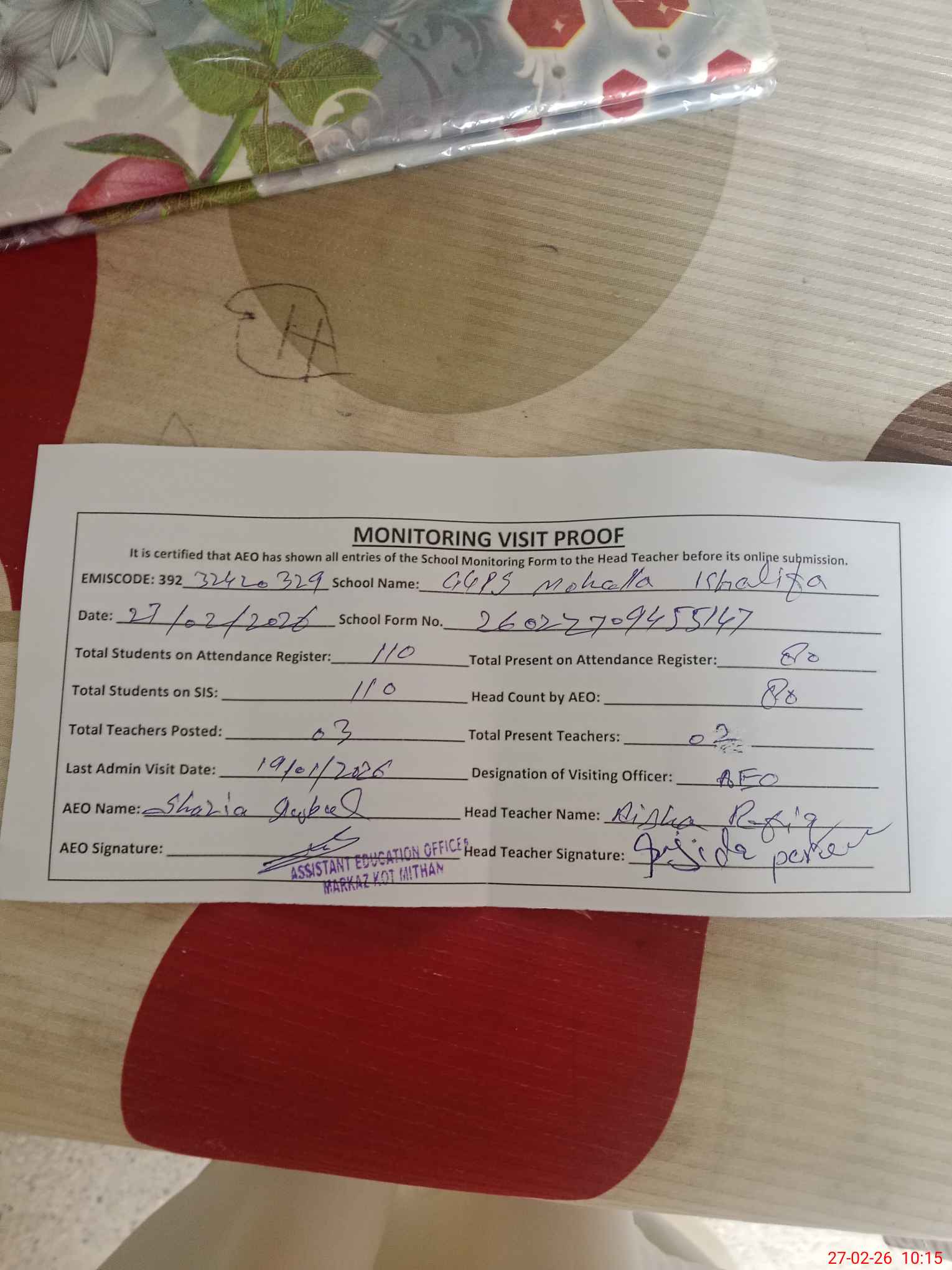| Attendance Register | Head Teacher | MEA with School | Visit Proof |