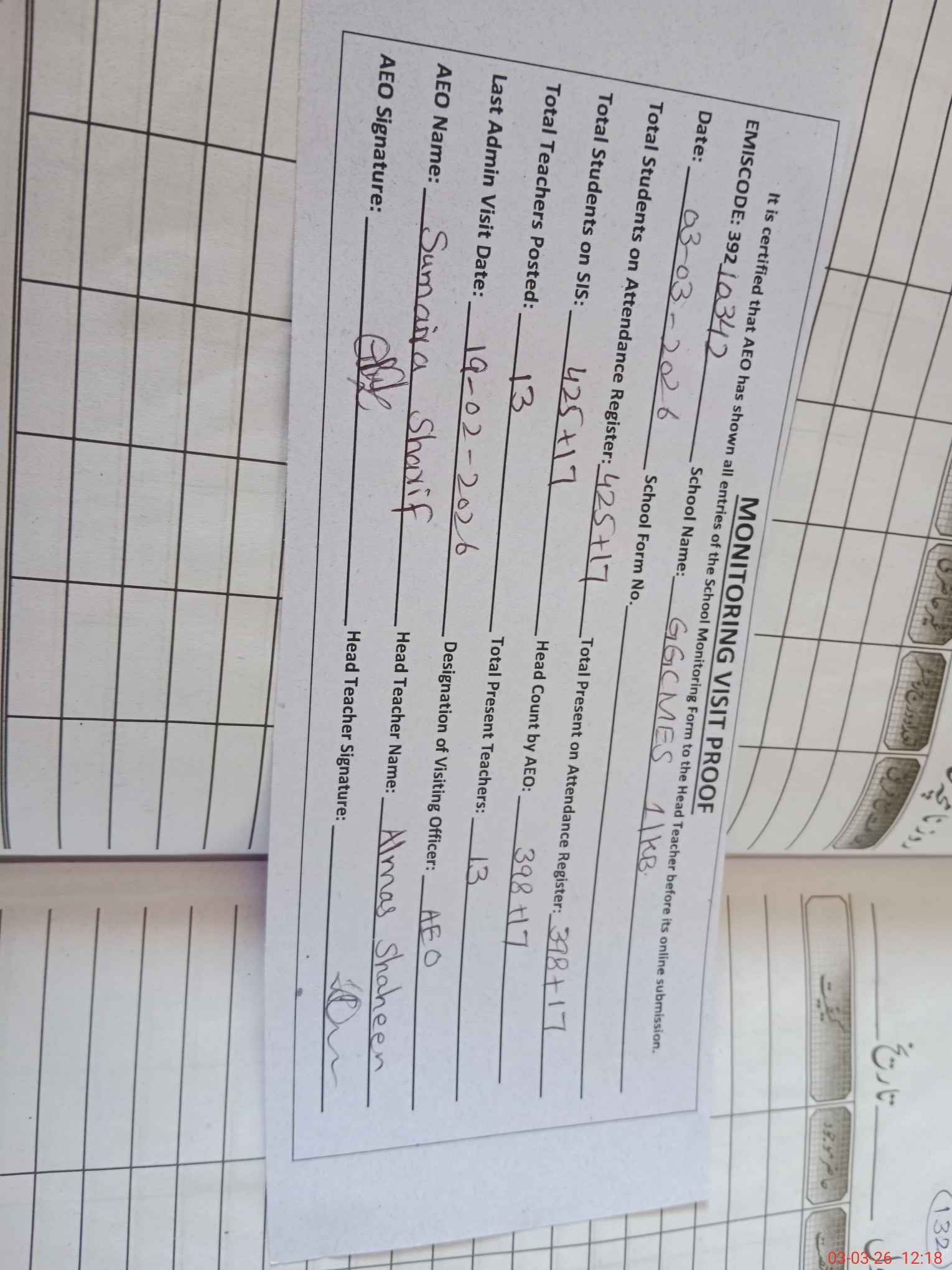 | Attendance Register | Head Teacher | MEA with School | Visit Proof |