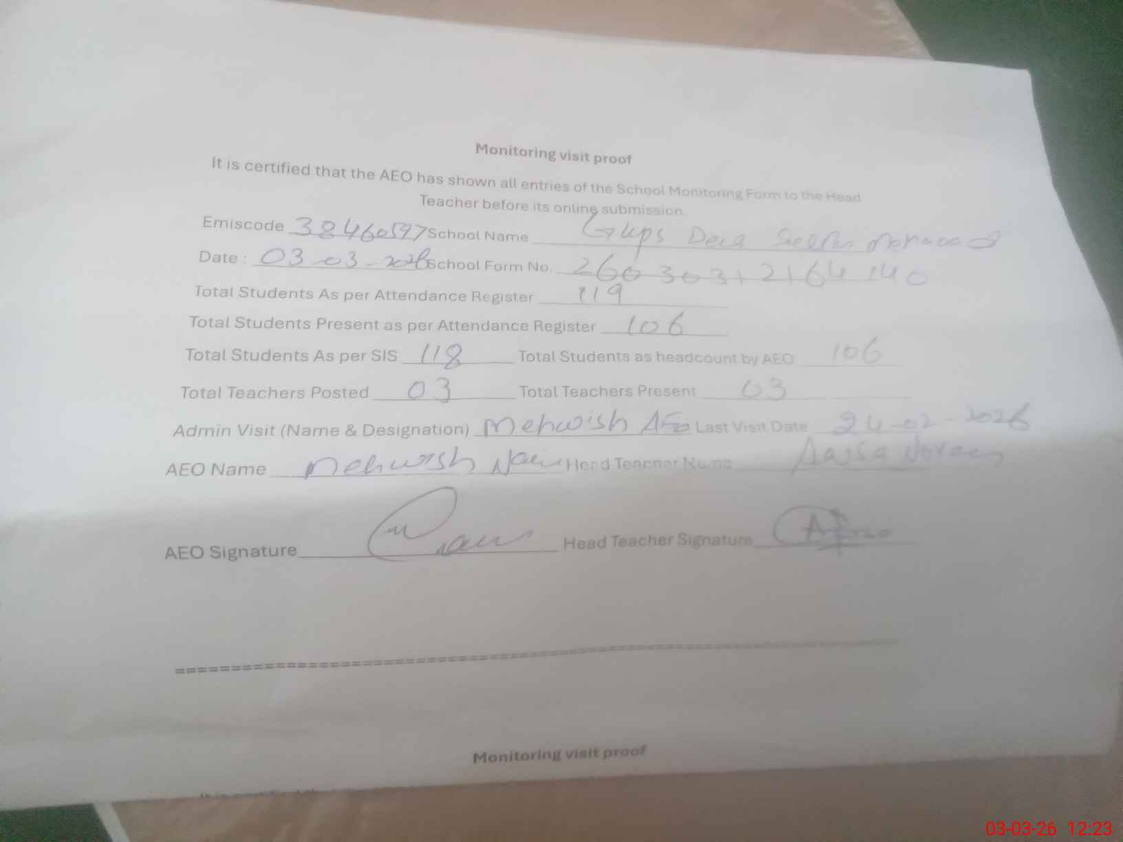 | Attendance Register | Head Teacher | MEA with School | Visit Proof |
