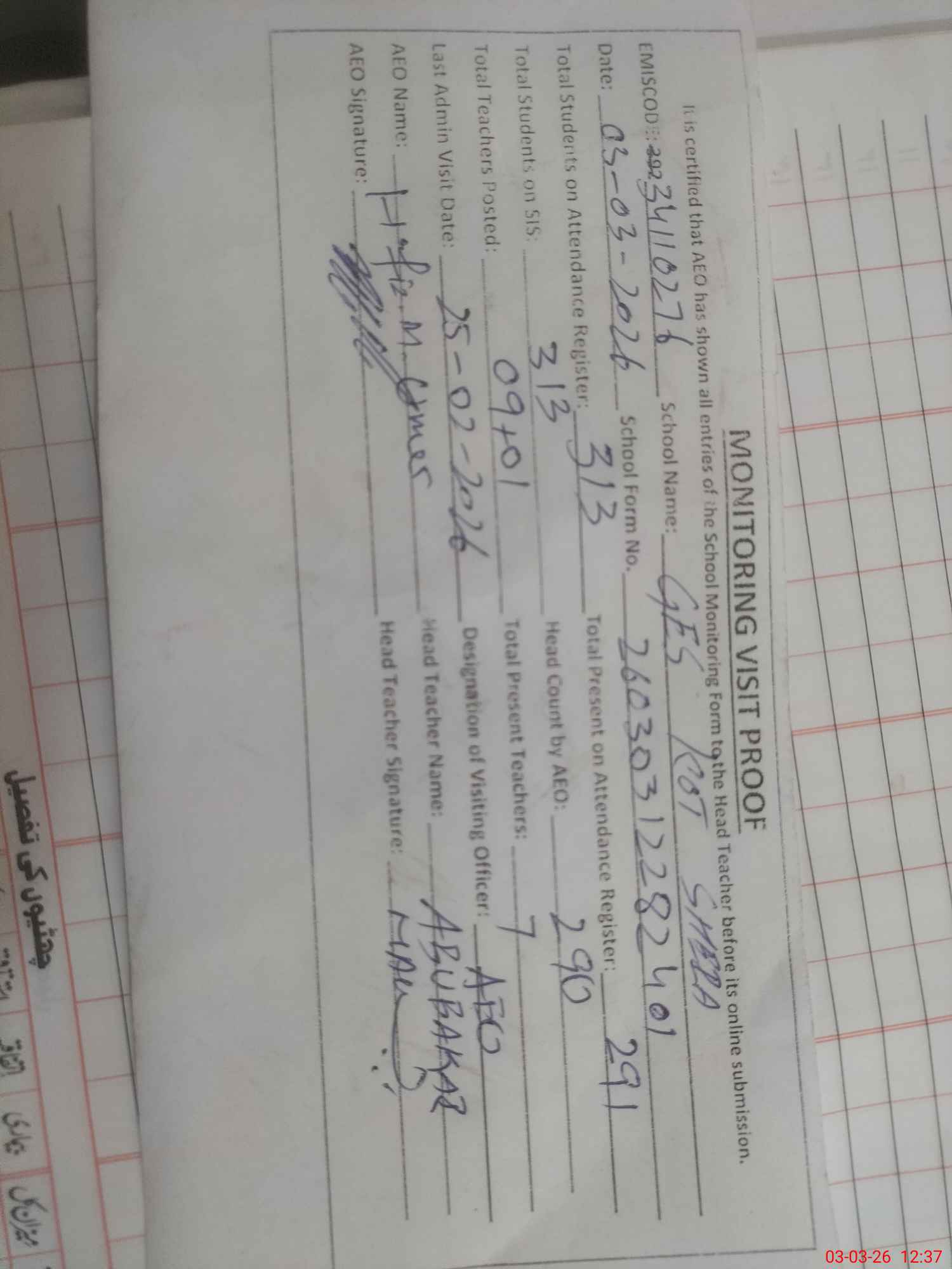 | Attendance Register | Head Teacher | MEA with School | Visit Proof |