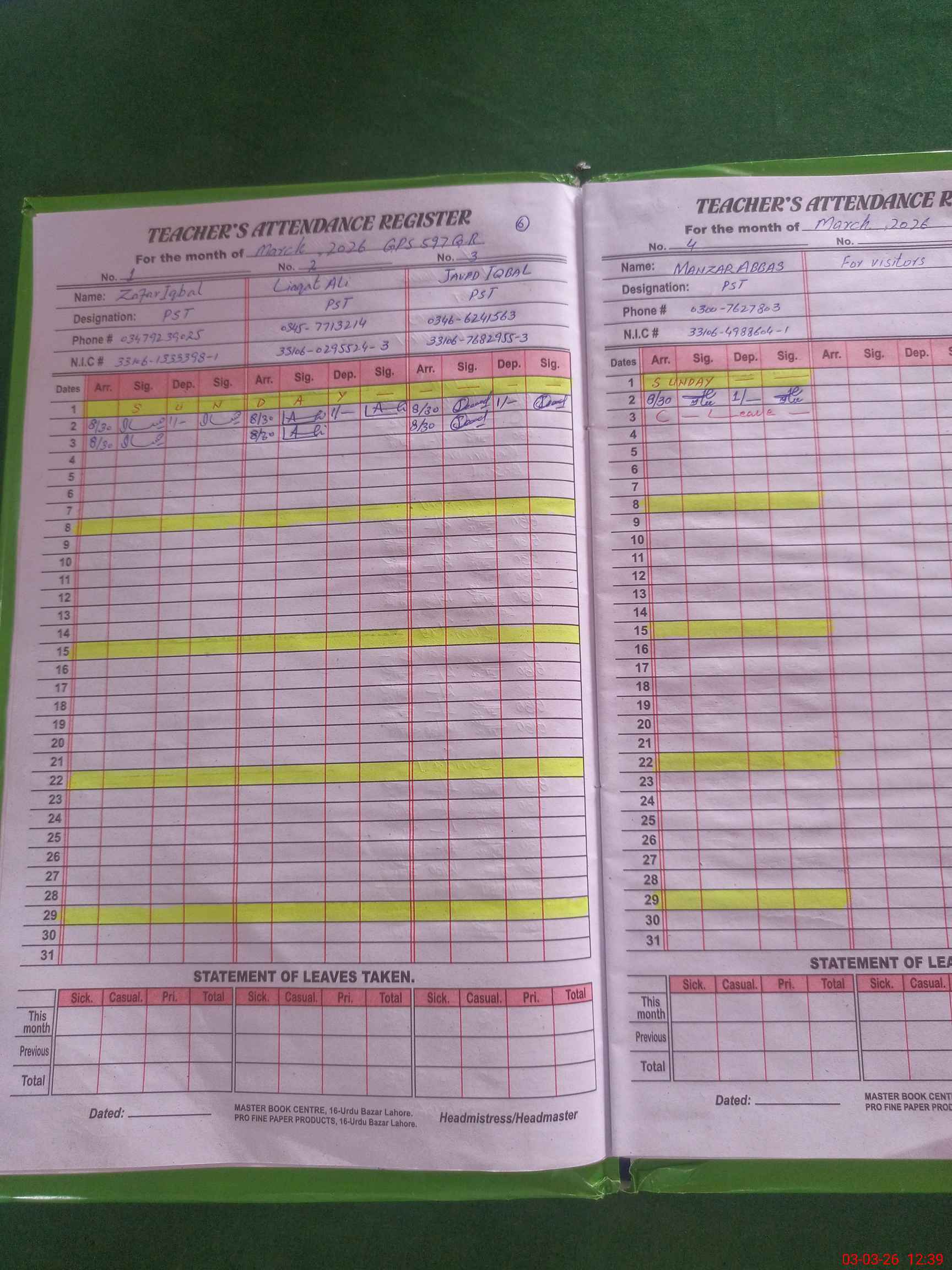 | CNIC | Full Name | Designation | R/C | Absence During Last Calender Month |