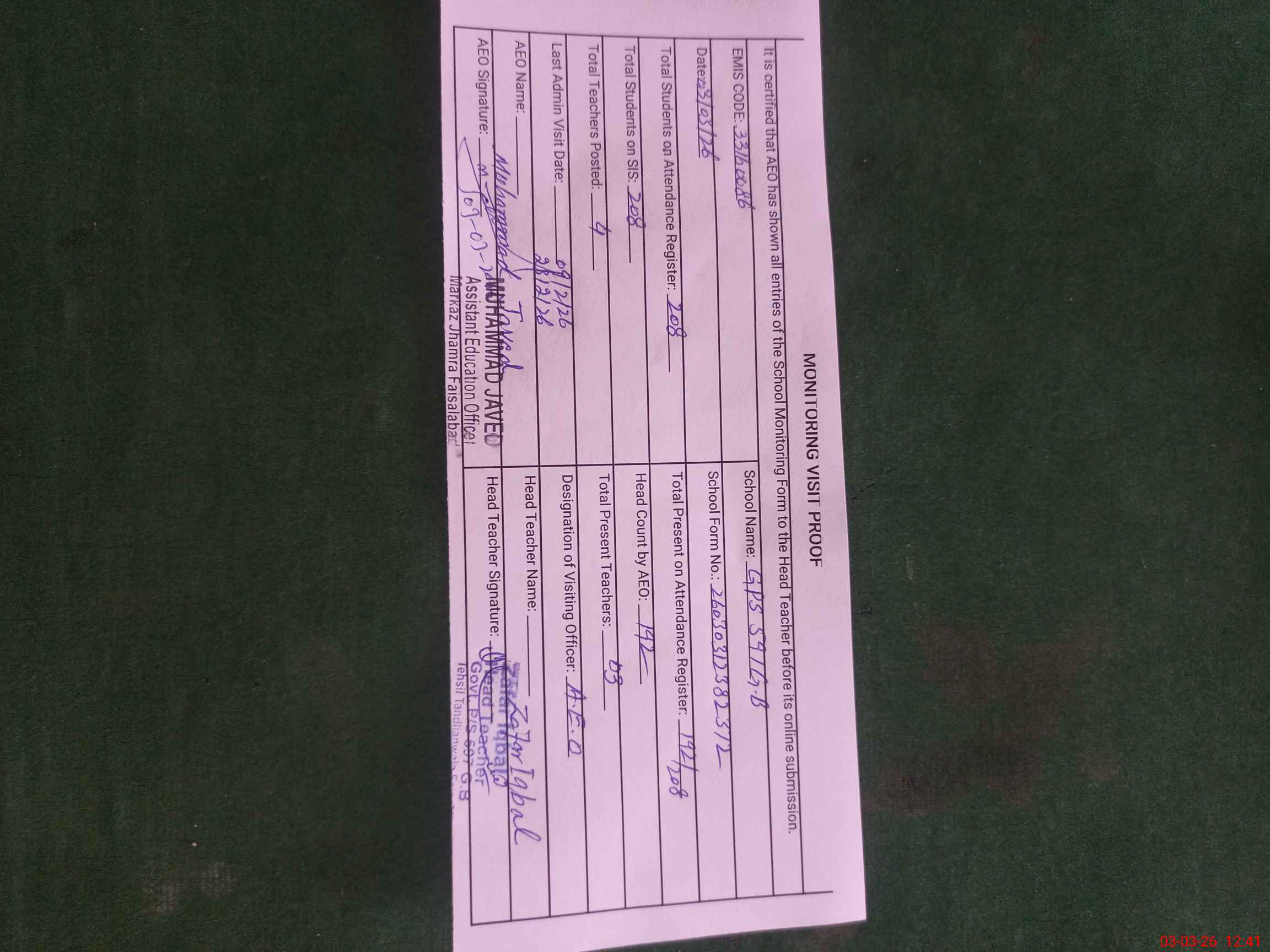| Certified that this School was Inspected by the Undersigned MEA/DMO Today and the Information Stated Above is as Per Record. | |||||