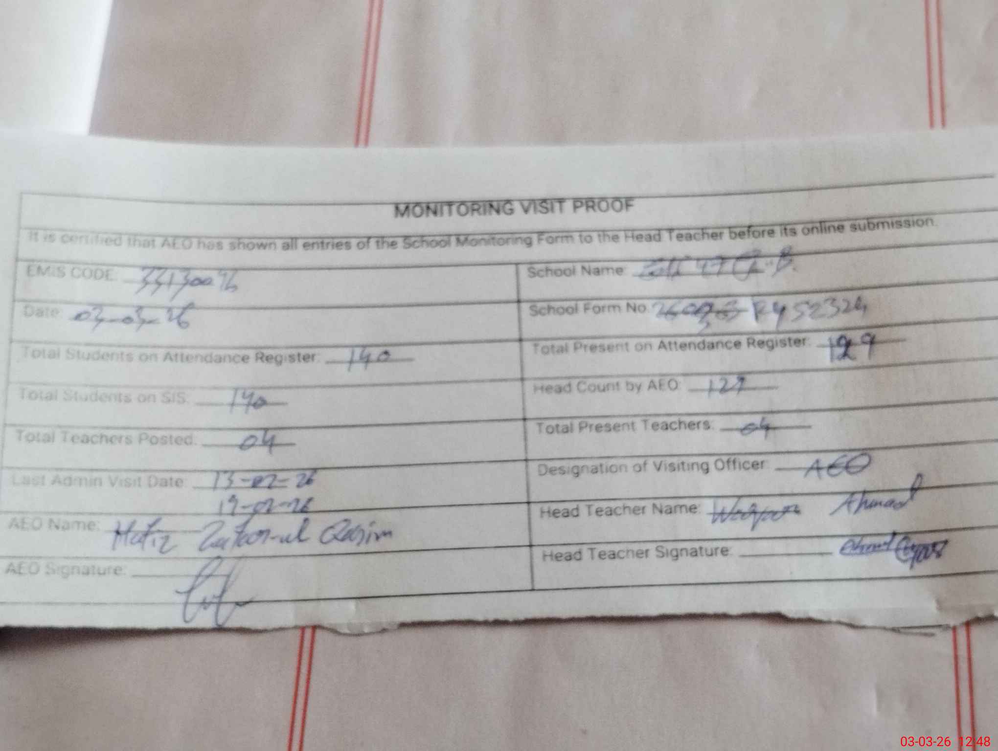 | Attendance Register | Head Teacher | MEA with School | Visit Proof |