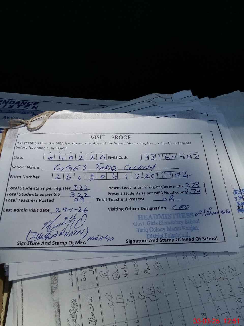 | Attendance Register | Head Teacher | MEA with School | Visit Proof |