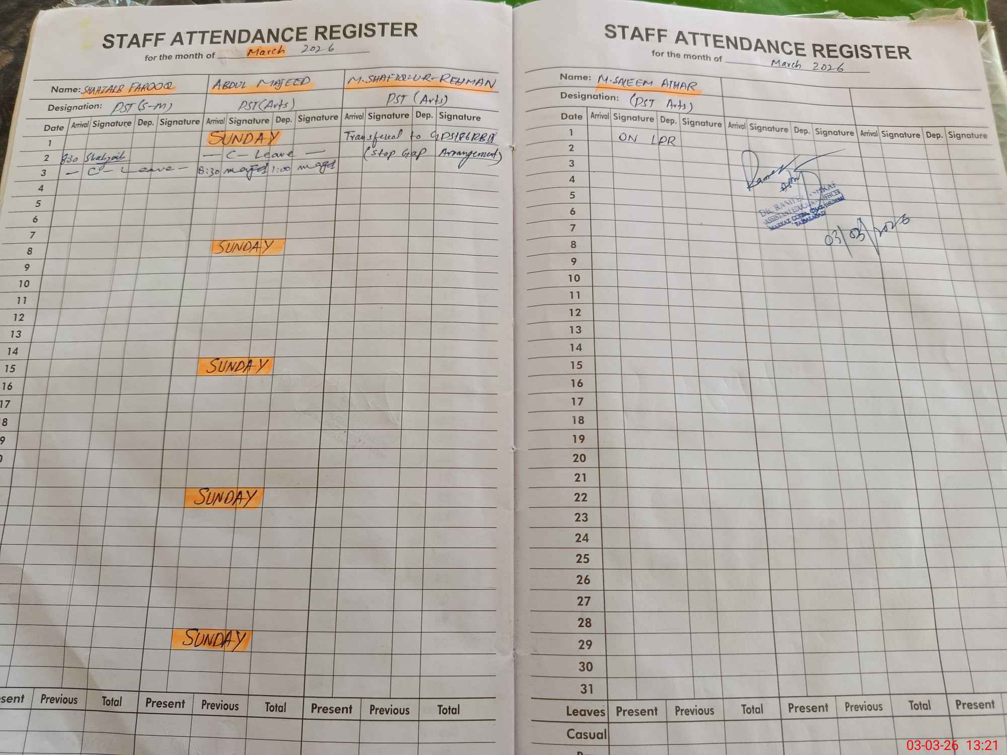 | CNIC | Full Name | Designation | R/C | Absence During Last Calender Month |