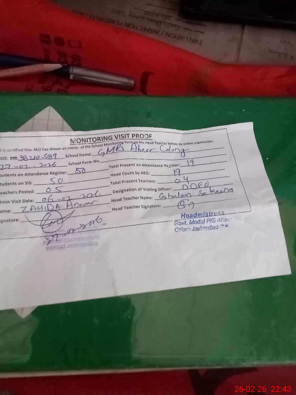 | Certified that this School was Inspected by the Undersigned MEA/DMO Today and the Information Stated Above is as Per Record. | |||||