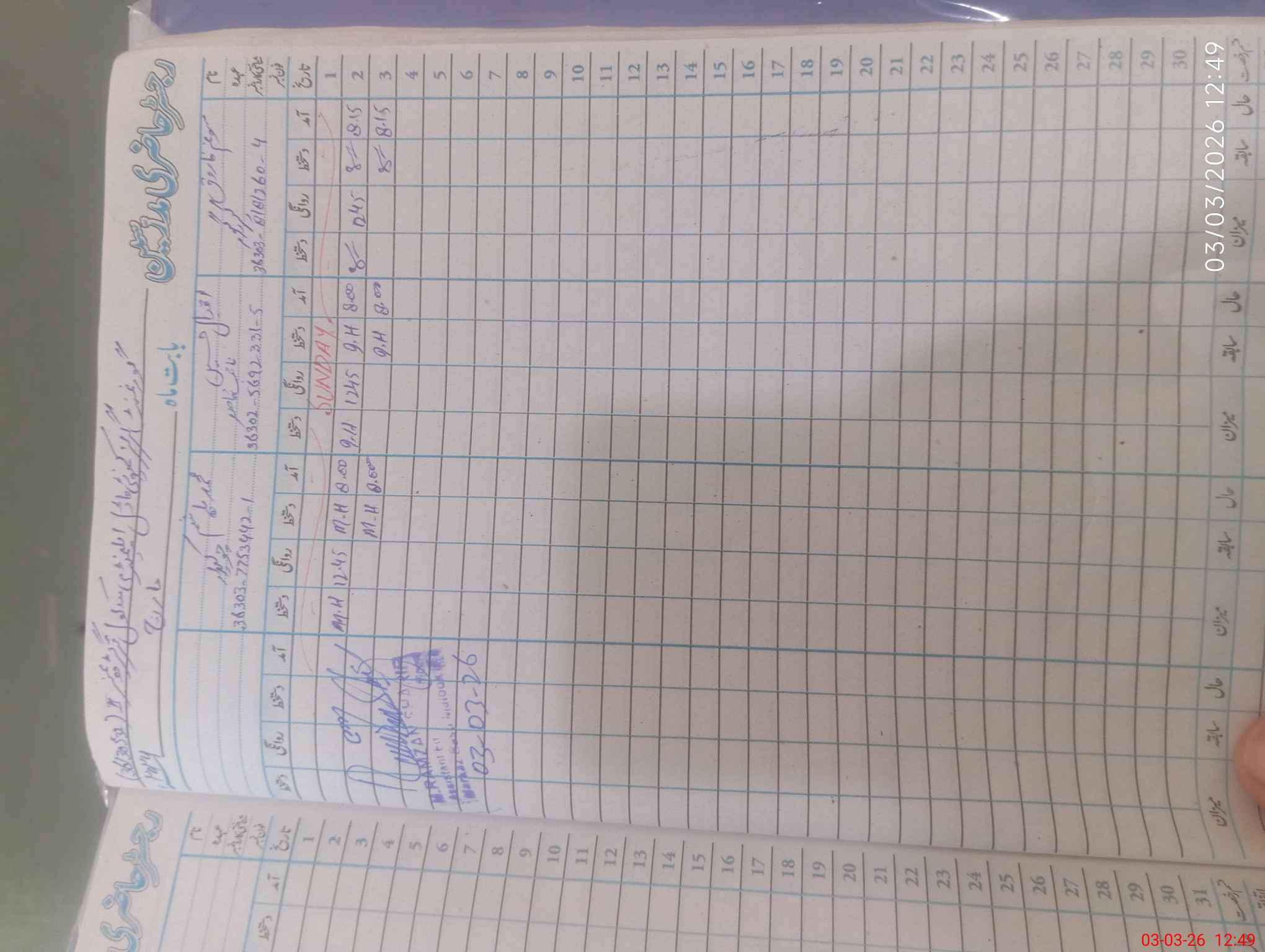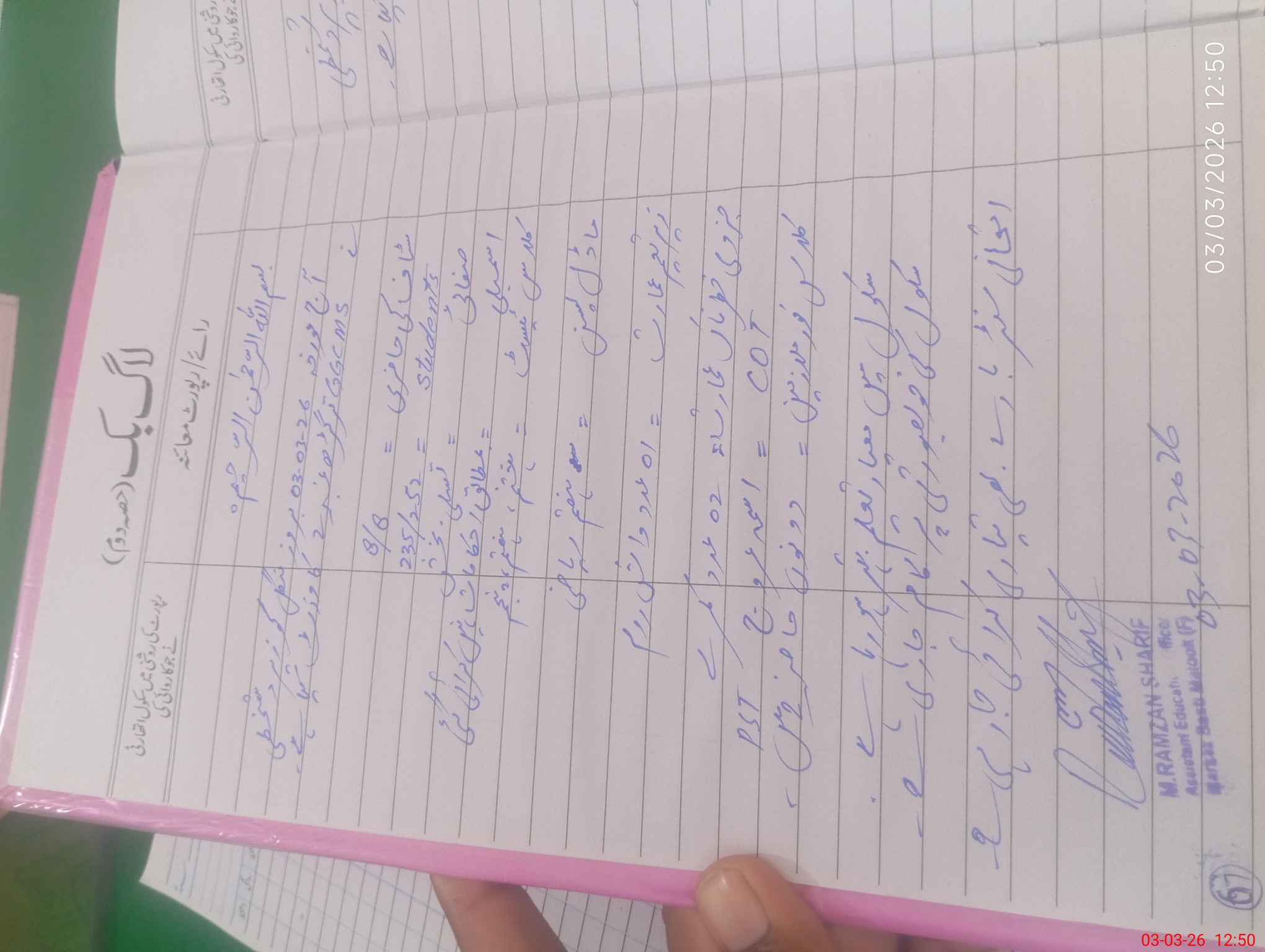 | Name: NA**** SU**** Designation: (School Headmaster's/Headmistress's) INCHARGE EST ARTS Phone/Cell Number: 03**** |