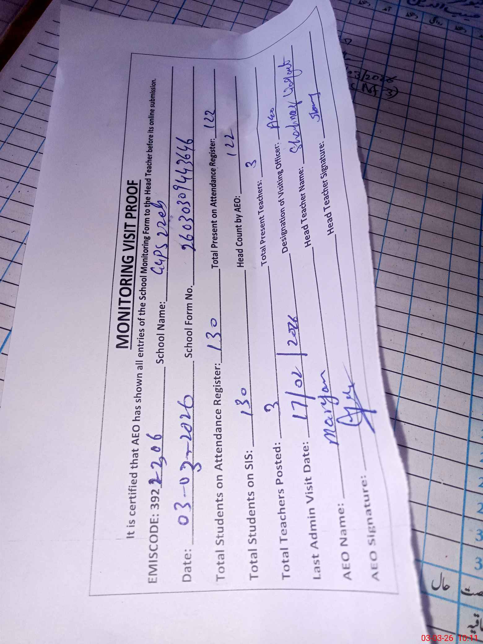 | Attendance Register | Head Teacher | MEA with School | Visit Proof |