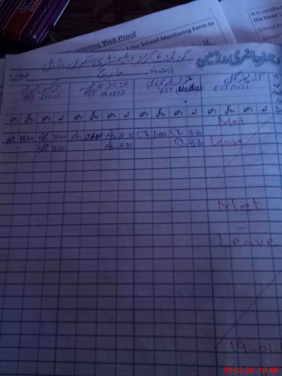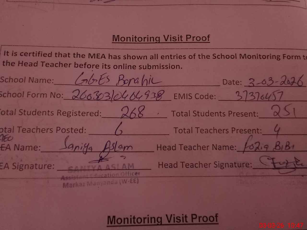 | Attendance Register | Head Teacher | MEA with School | Visit Proof |