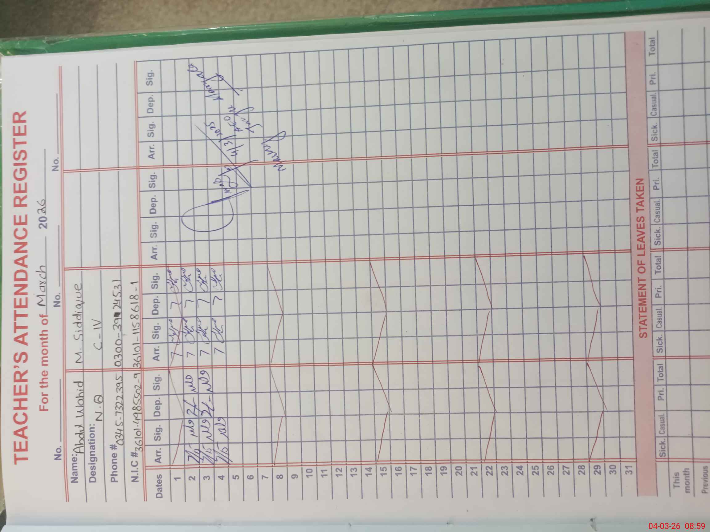 | CNIC | Full Name | Designation | R/C | Absence During Last Calender Month |