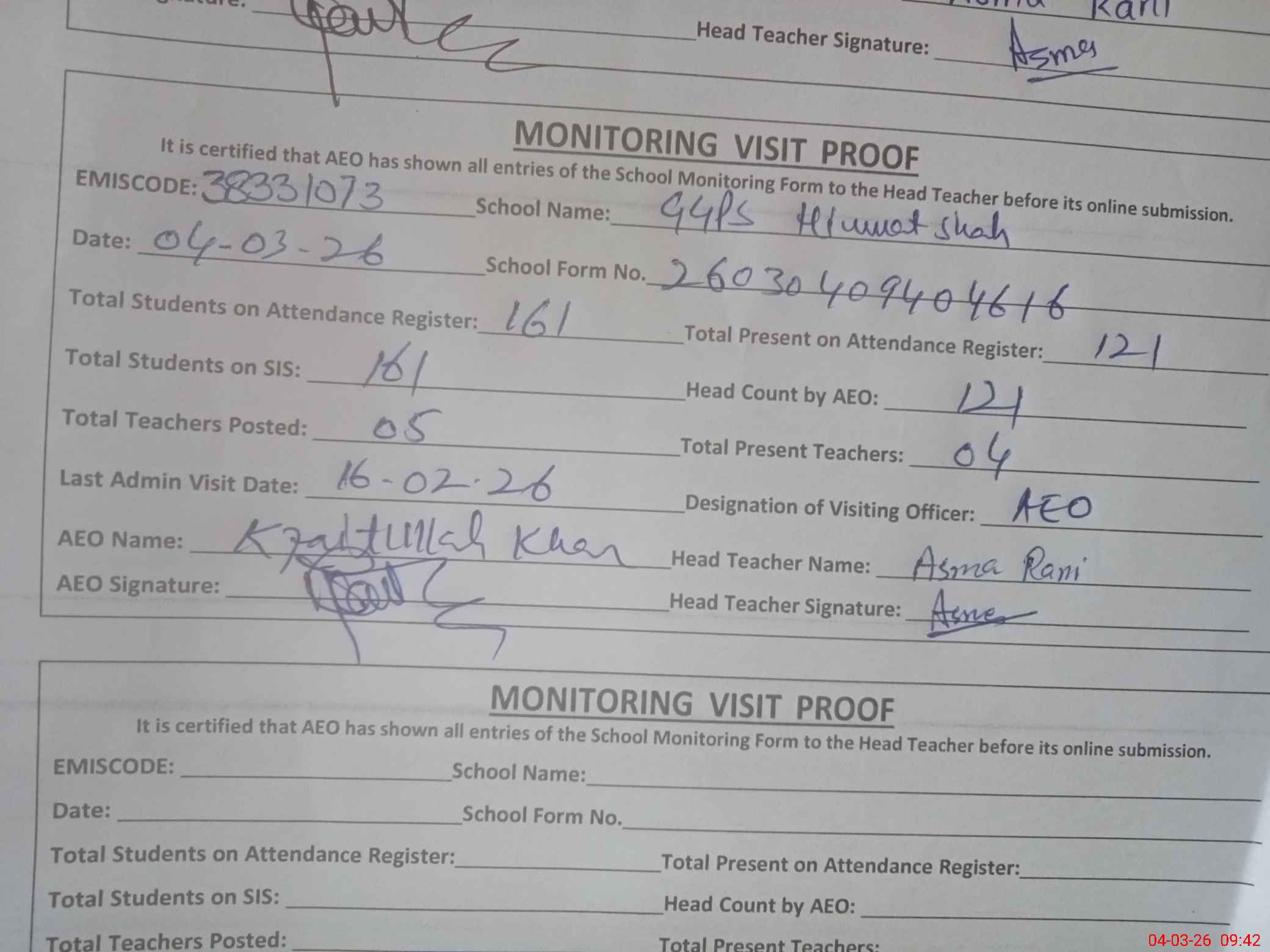 | Attendance Register | Head Teacher | MEA with School | Visit Proof |