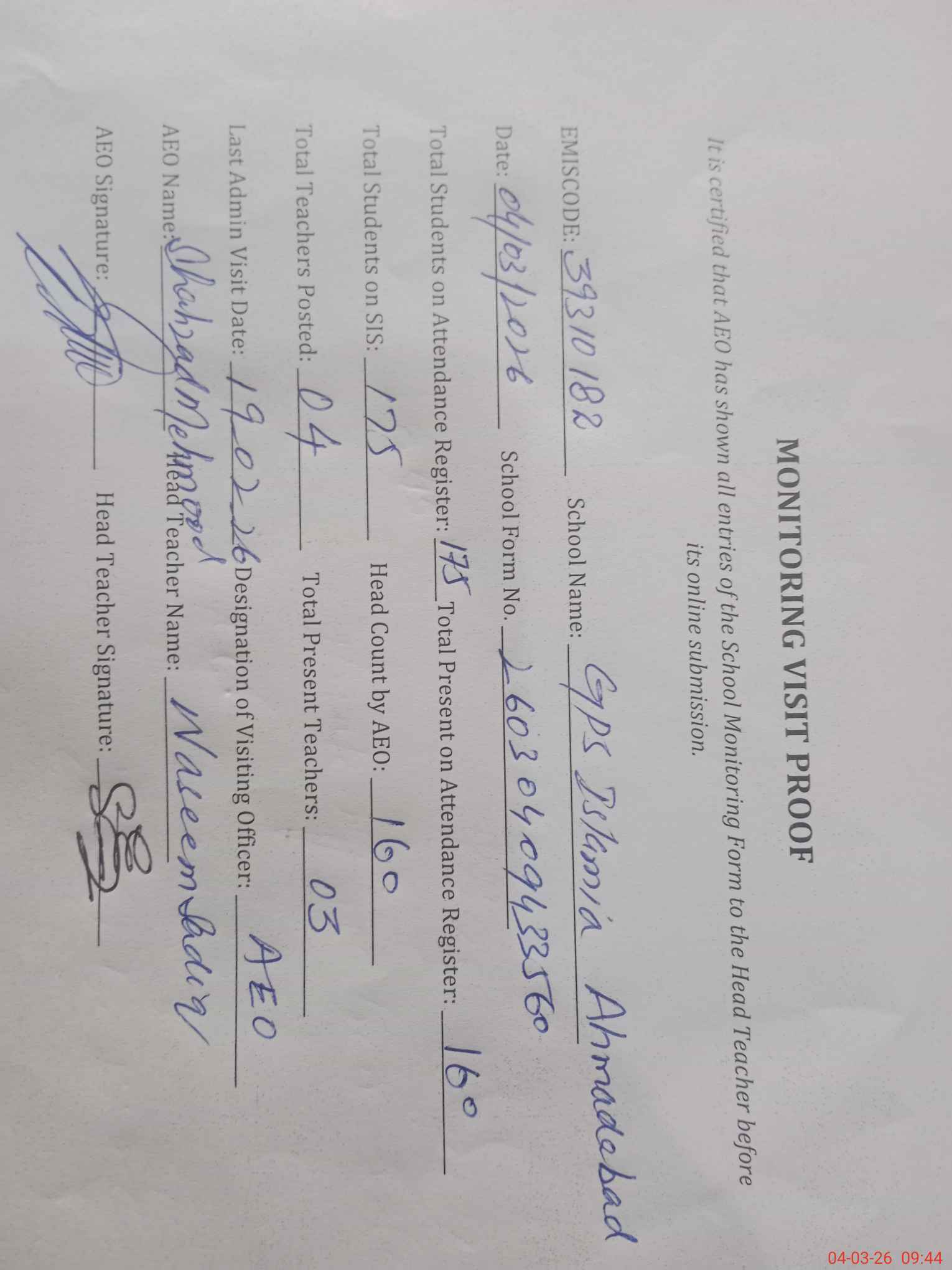 | EMIS Code: 39310182 | Name of School: GPS ISLAMIA AHMED ABAD | |||