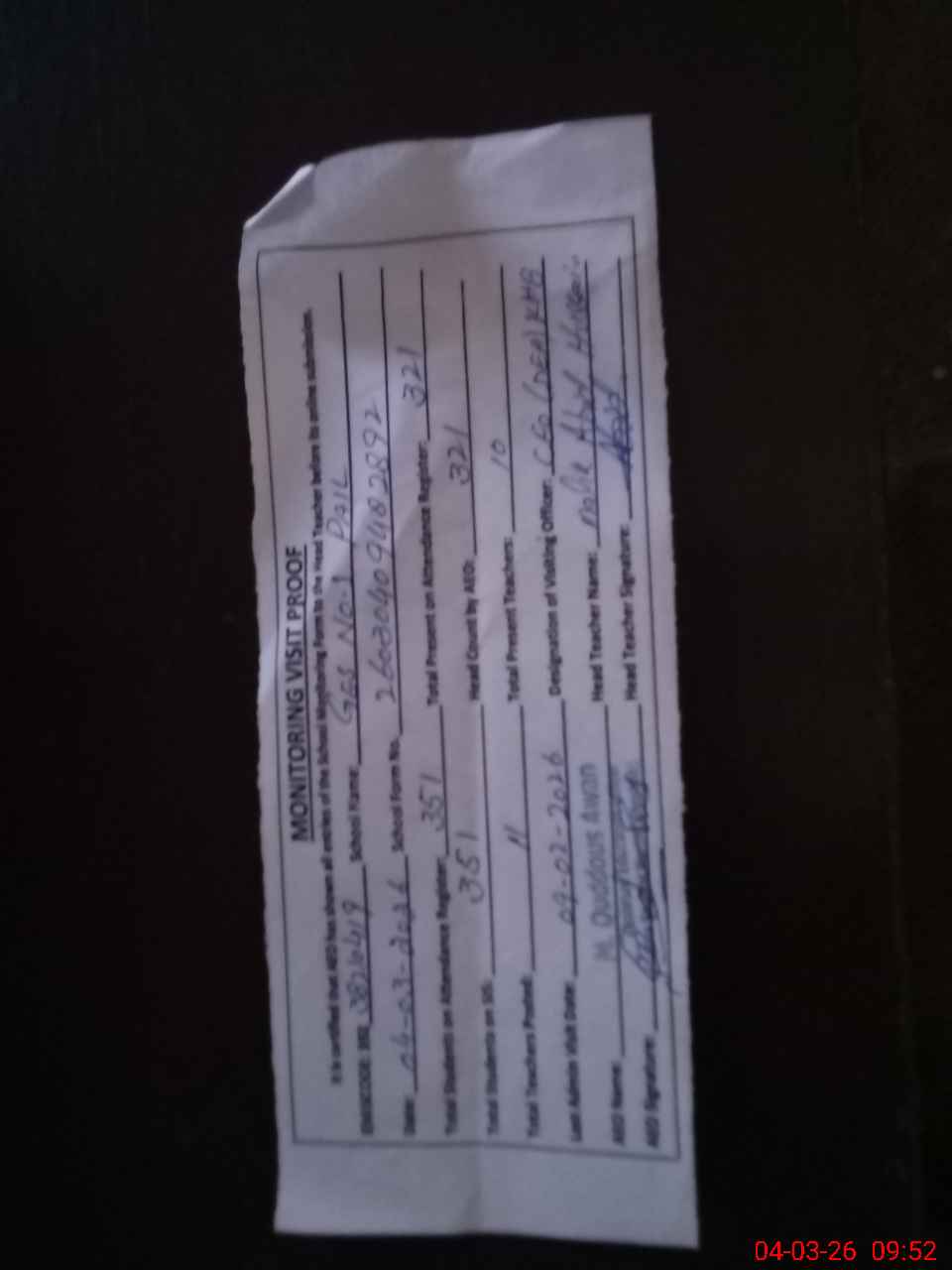 | Attendance Register | Head Teacher | MEA with School | Visit Proof |