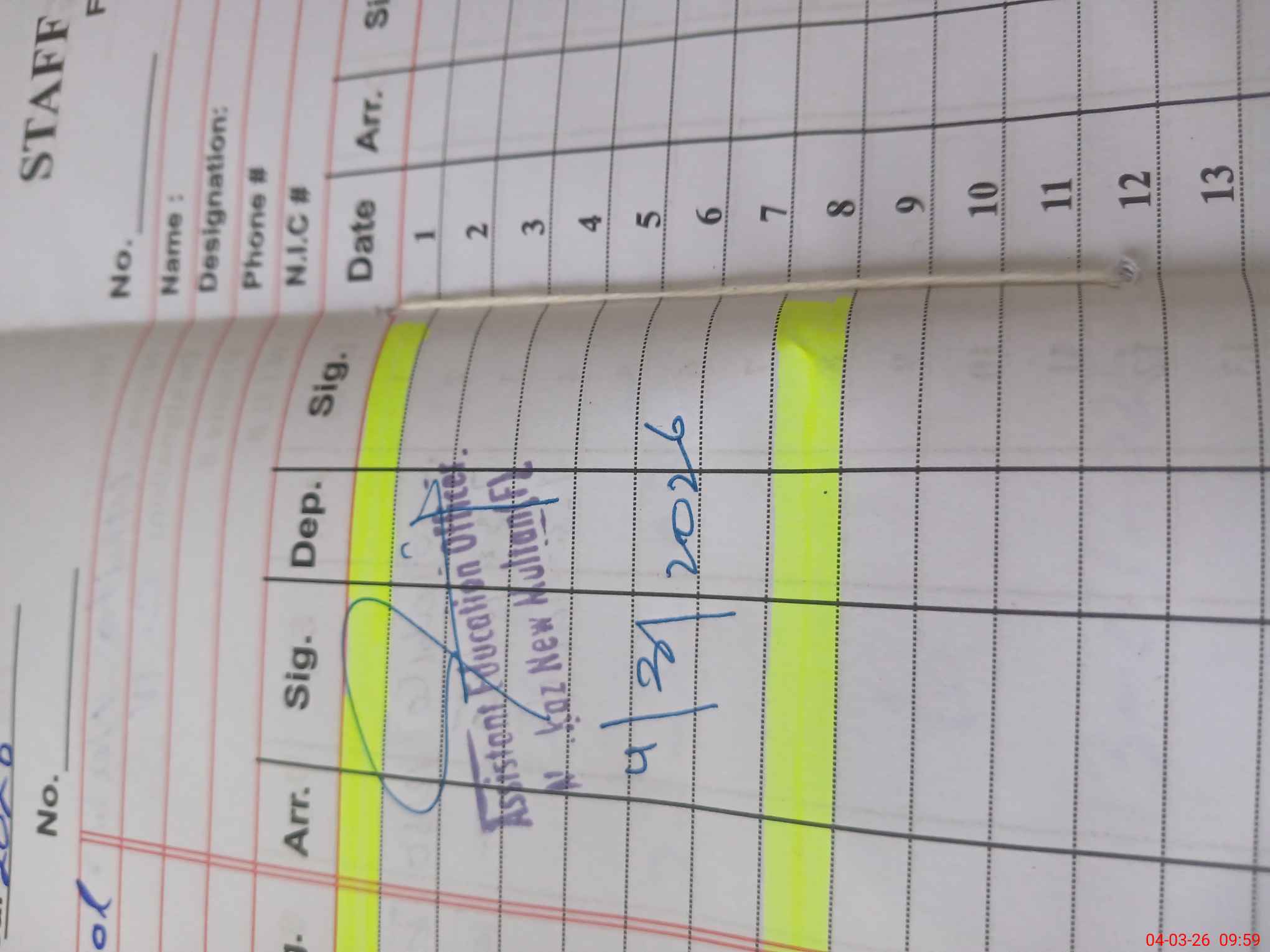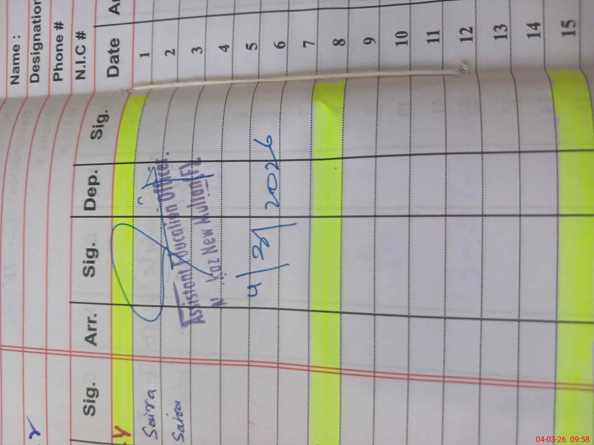 | Name: Wa**** Ni**** Designation: (School Headmaster's/Headmistress's) S.S.T. Phone/Cell Number: 03**** |