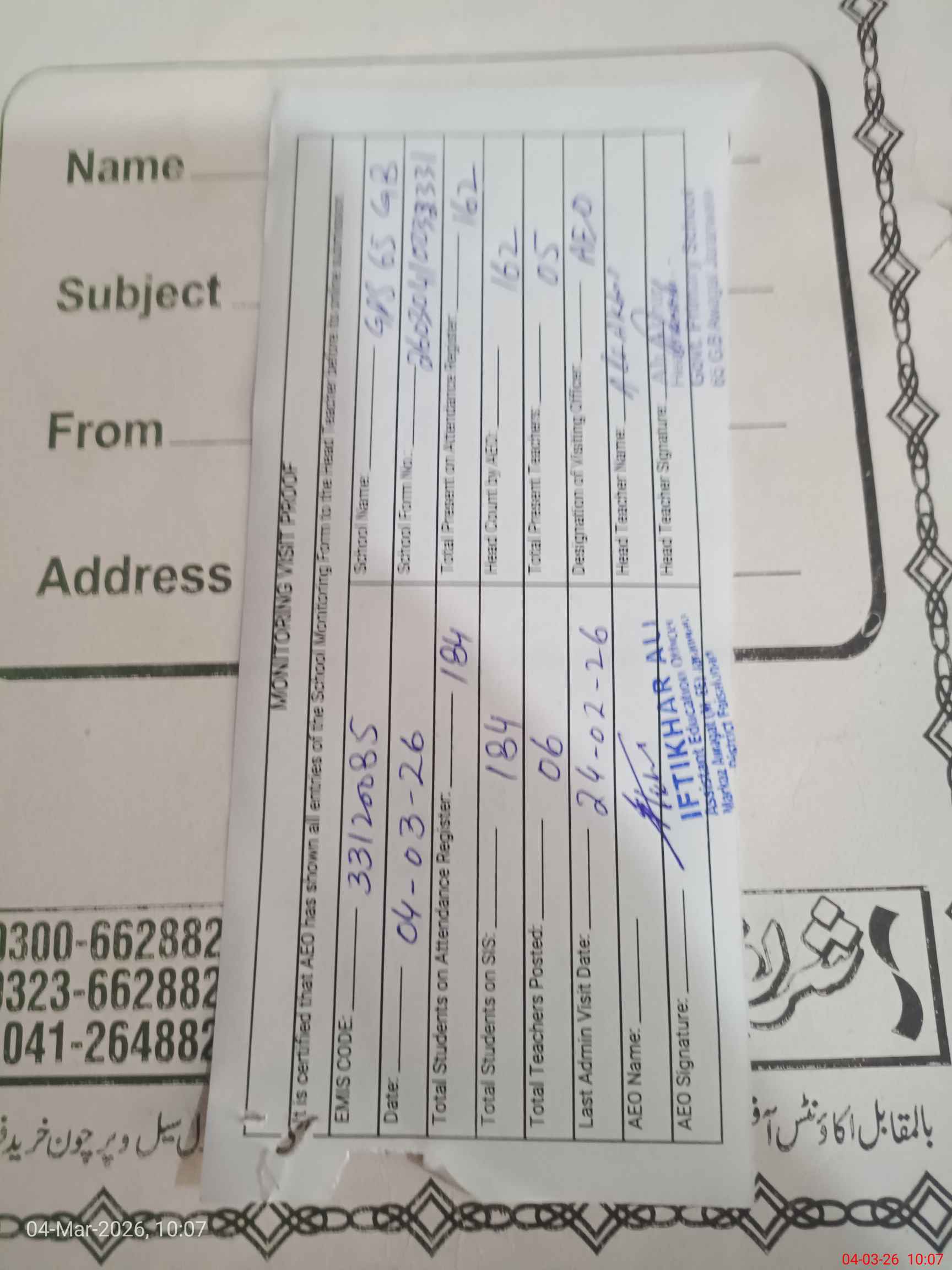 | EMIS Code: 33120085 | Name of School: GPS CHAK 65 GB | |||