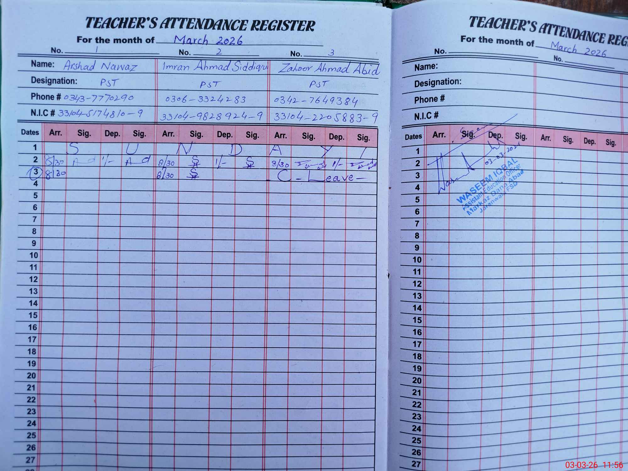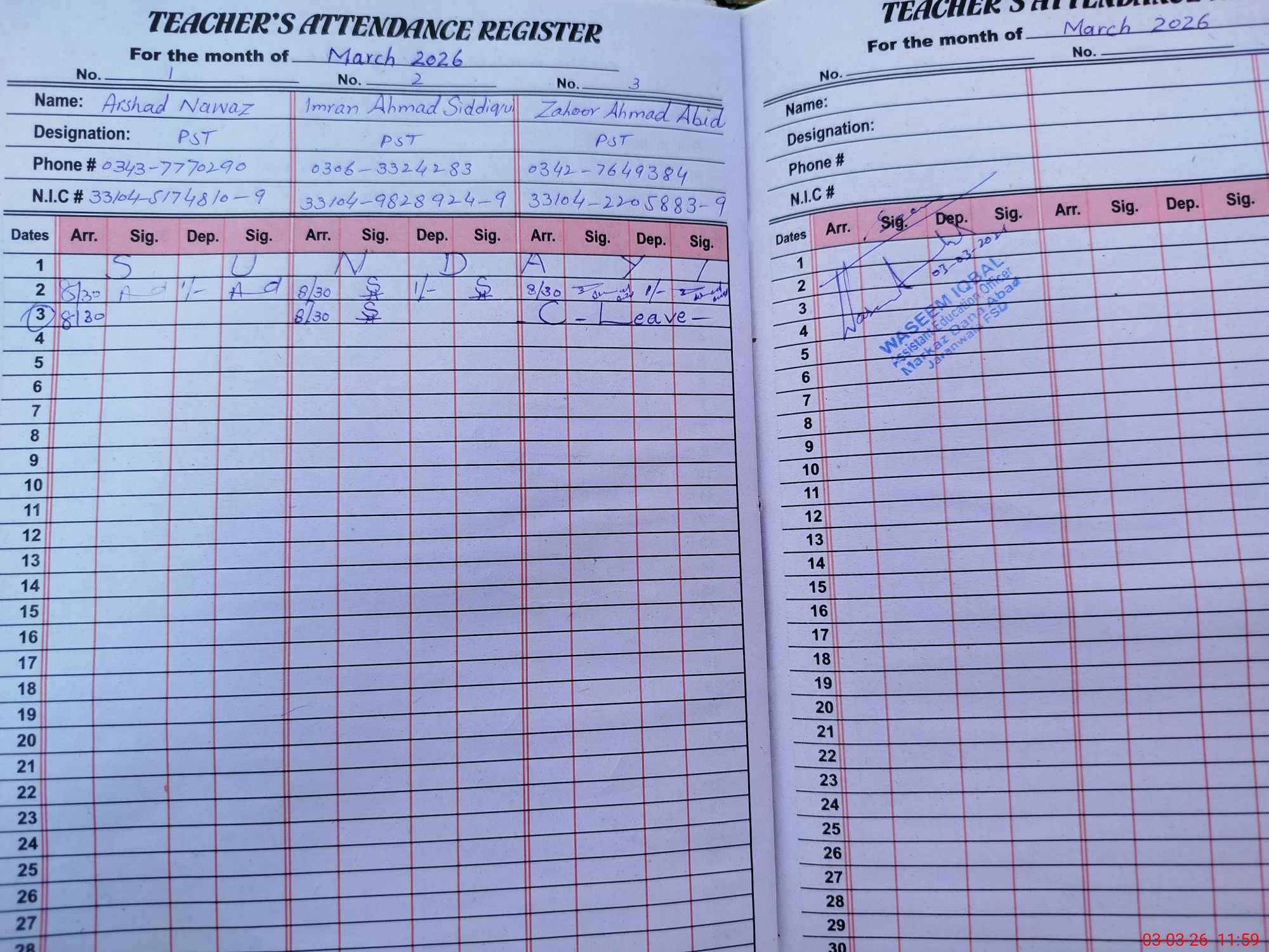 | Name: AR**** NA**** Designation: (School Headmaster's/Headmistress's) PST Phone/Cell Number: 03**** |