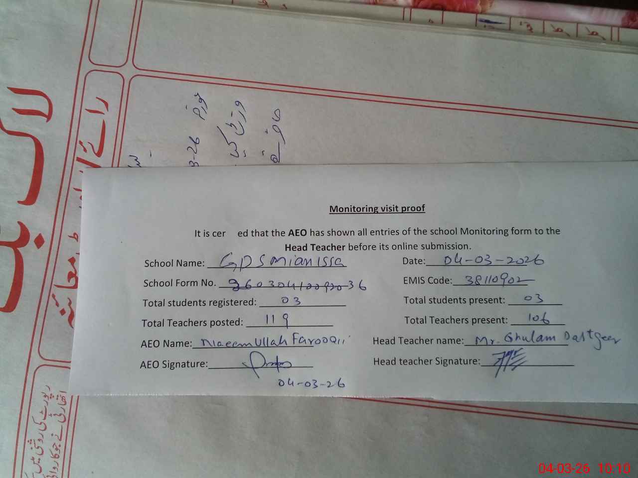 | Monitoring Date: 04-03-2026 | Start Time: 04-03-2026 10:01 AM | End Time: 04-03-2026 10:11 AM | Name of MEA: Na**** ul**** Fa**** | |