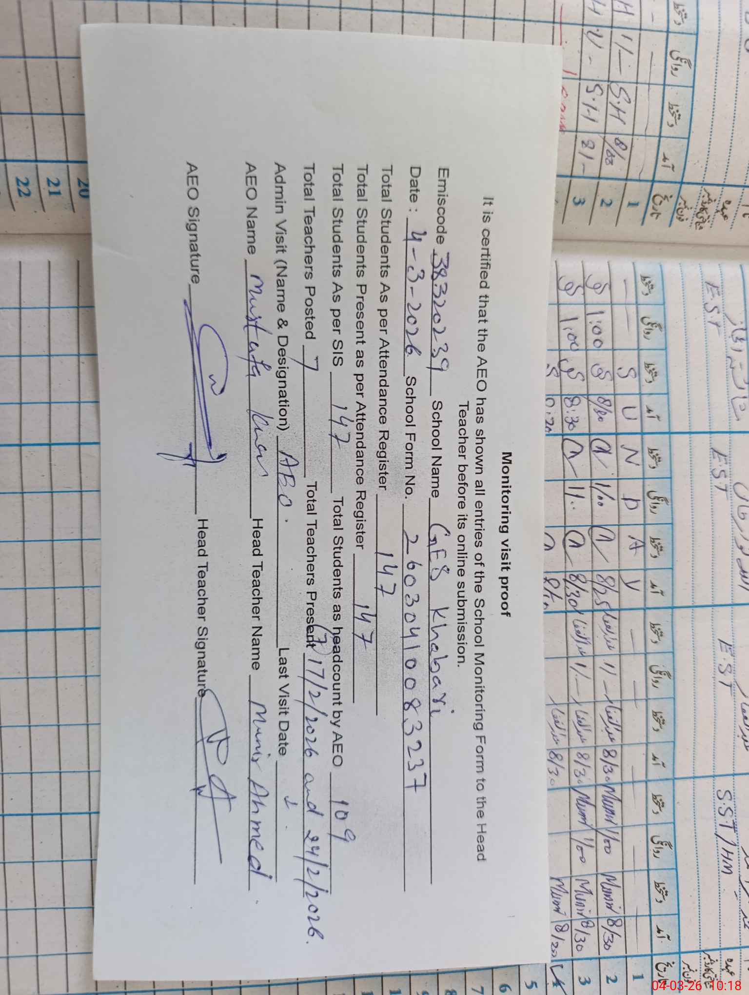 | Attendance Register | Head Teacher | MEA with School | Visit Proof |