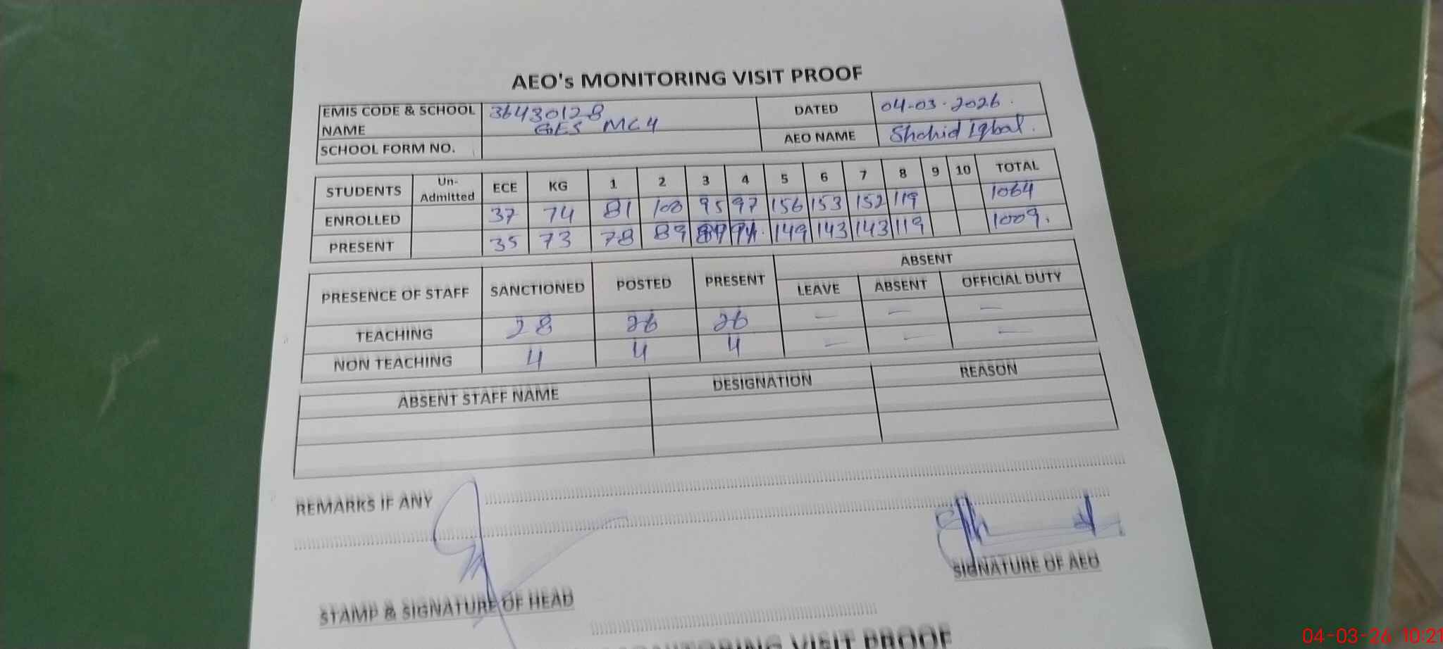 | Attendance Register | Head Teacher | MEA with School | Visit Proof |