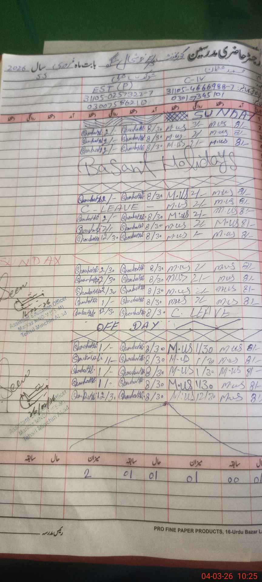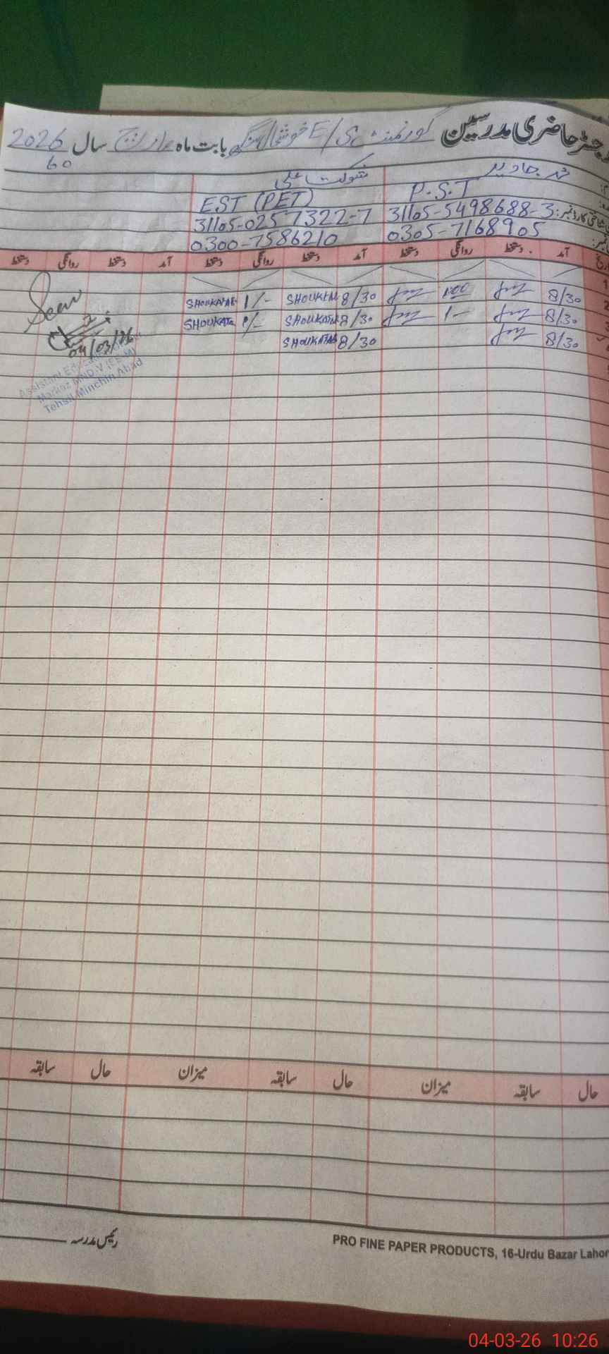 | Name: Mo**** Ar**** Designation: (School Headmaster's/Headmistress's) EST Phone/Cell Number: 03**** |