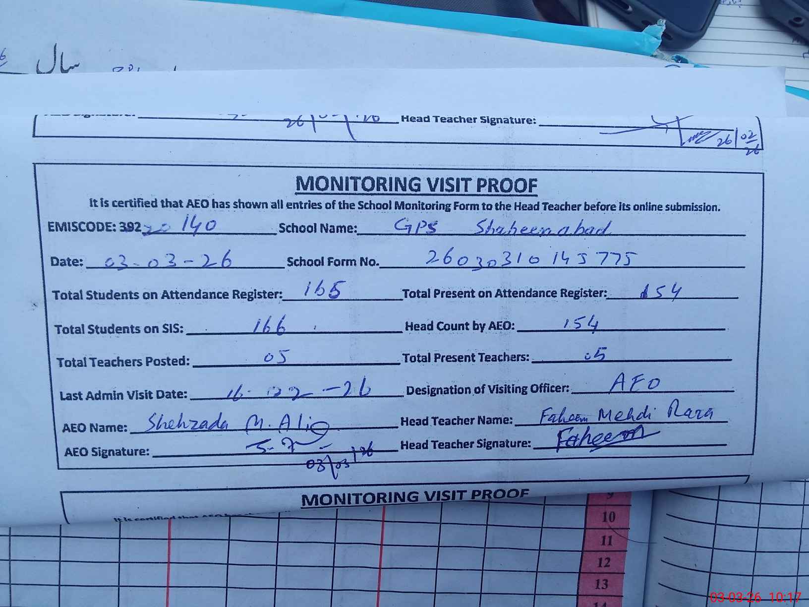 | Attendance Register | Head Teacher | MEA with School | Visit Proof |