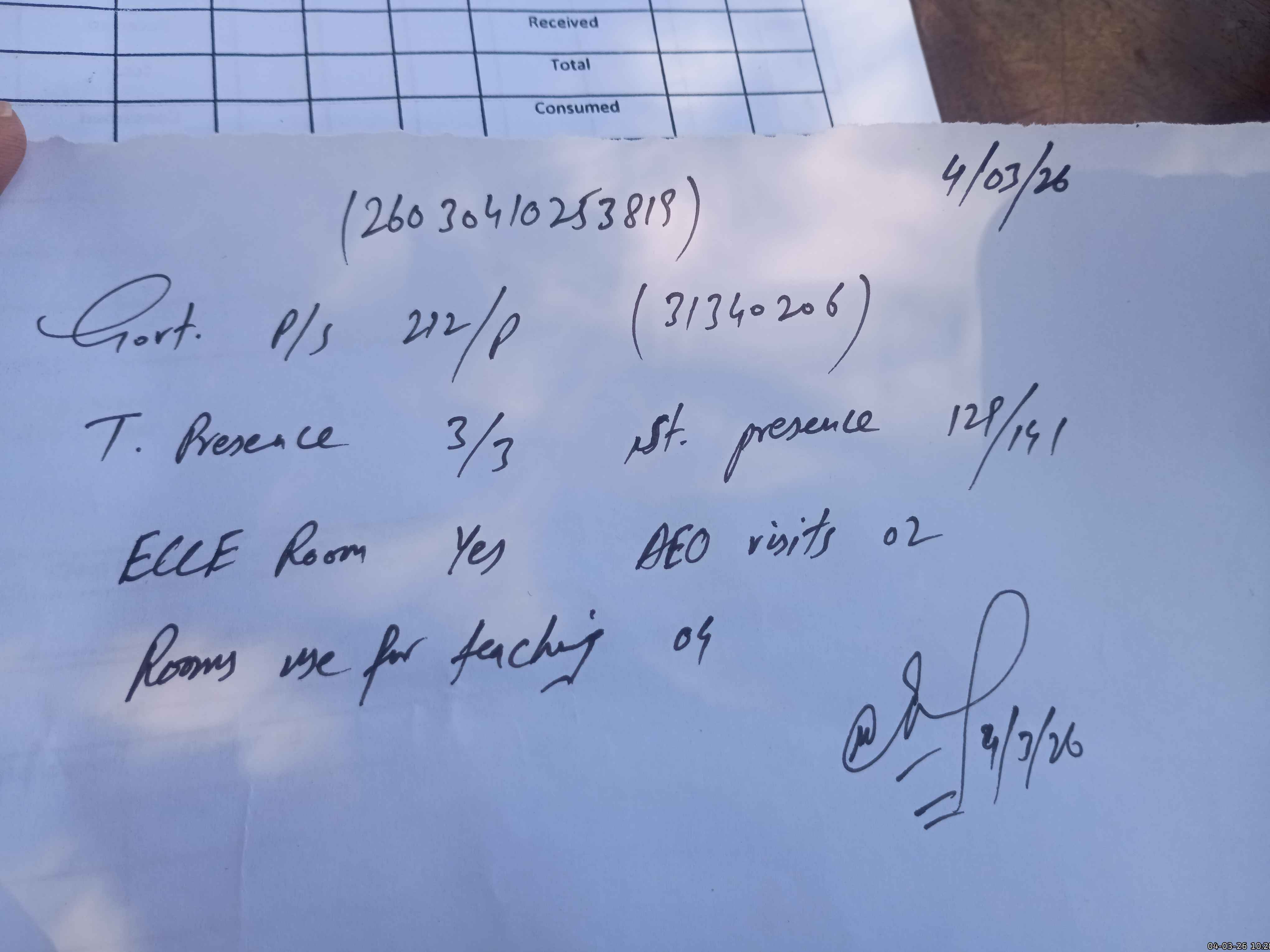 | Attendance Register | Head Teacher | MEA with School | Visit Proof |