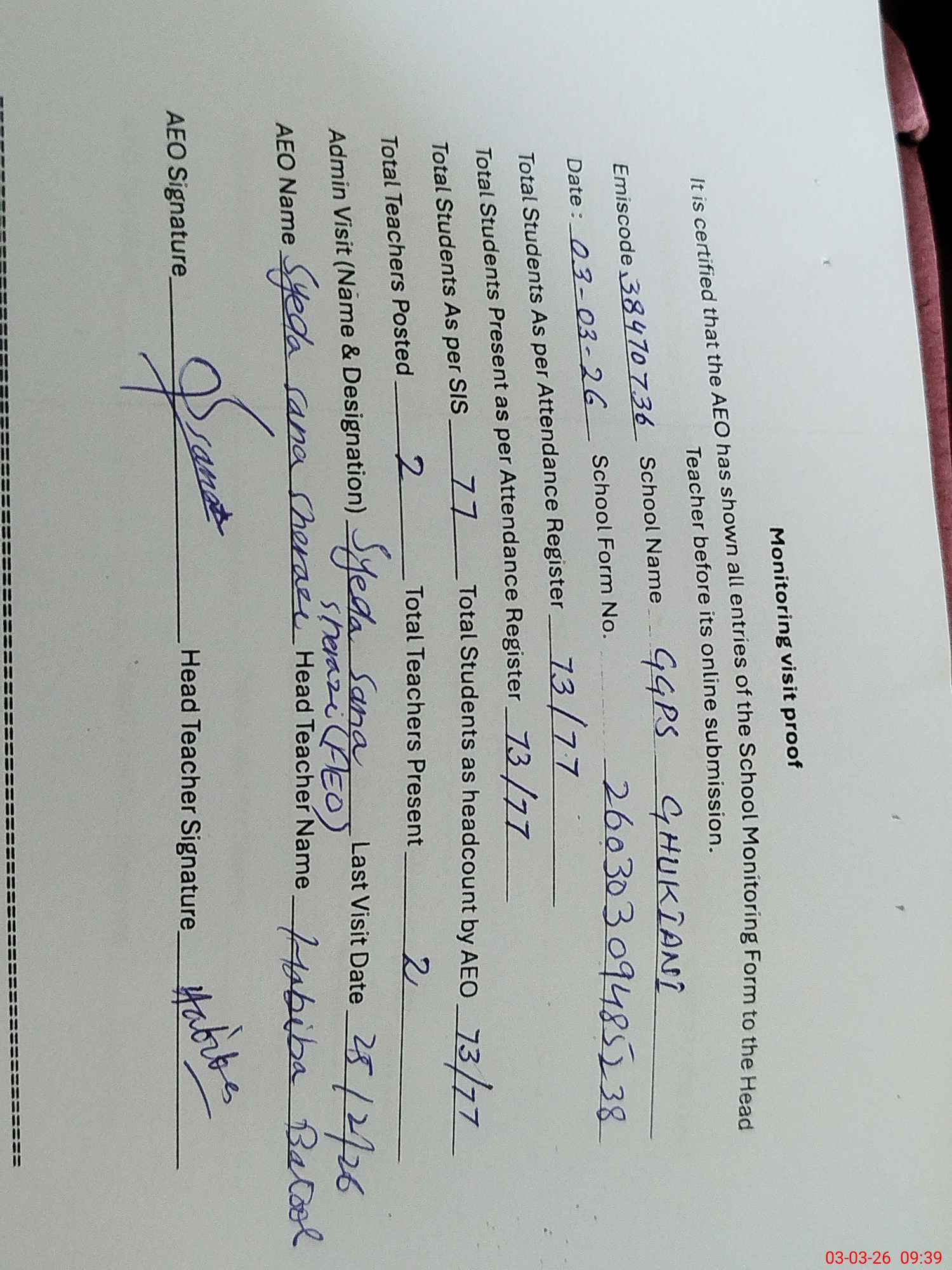 | Attendance Register | Head Teacher | MEA with School | Visit Proof |