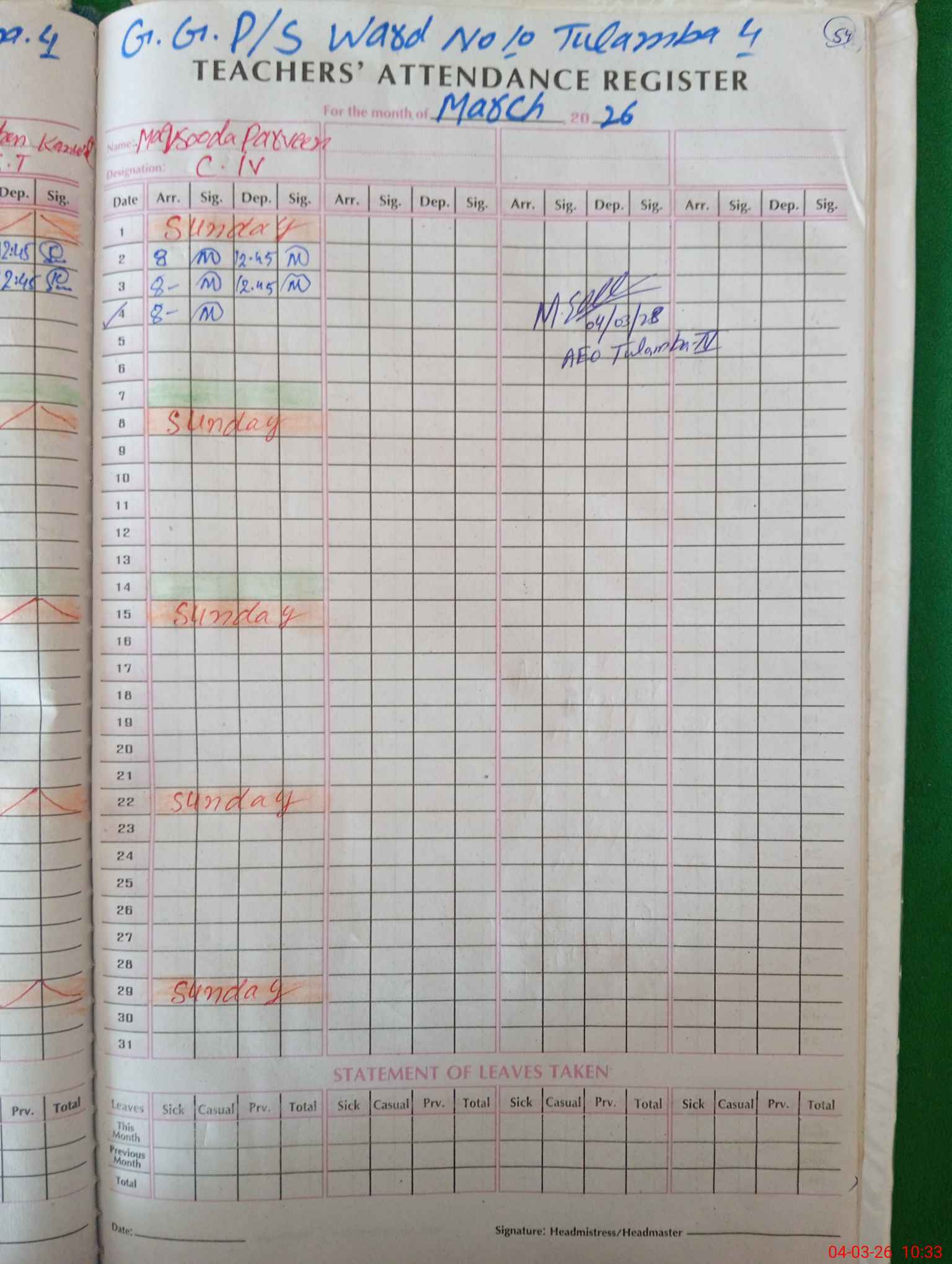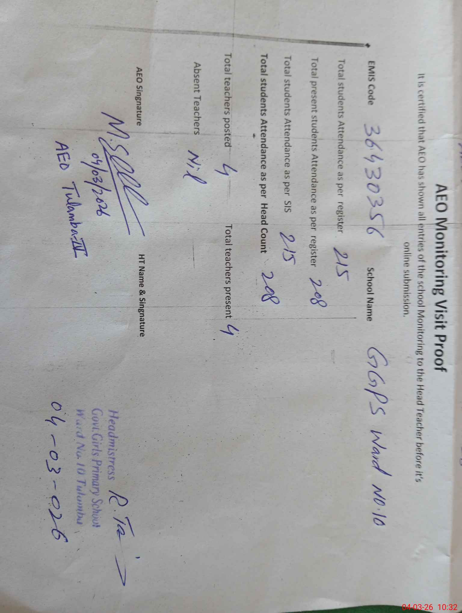 | Attendance Register | Head Teacher | MEA with School | Visit Proof |