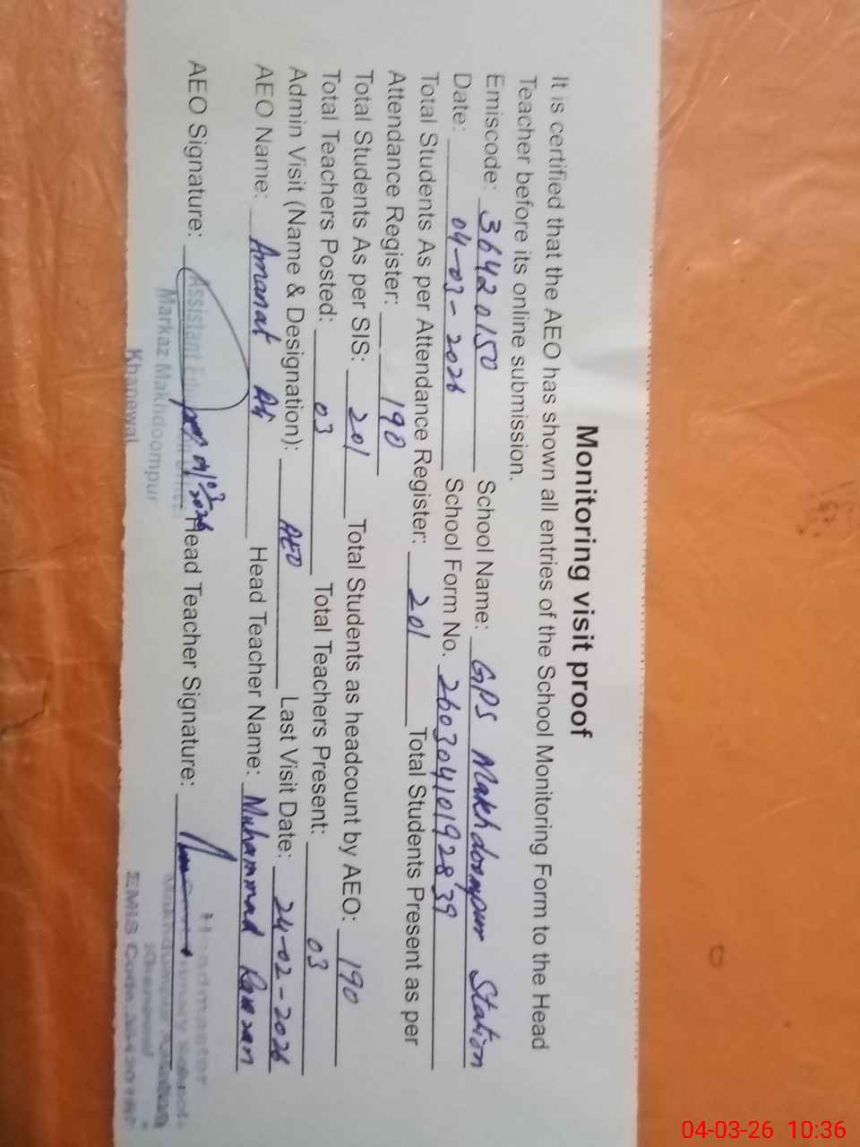 | EMIS Code: 36420150 | Name of School: GPS MAKHDOOM PUR STATION, P/O MAKHDOOM PUR, KHANEWAL | |||