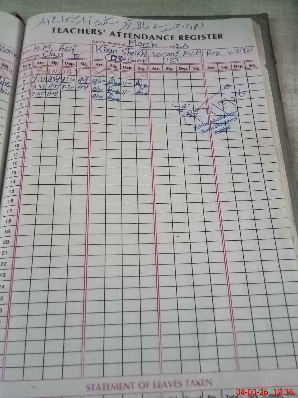 | CNIC | Full Name | Designation | R/C | Absence During Last Calender Month |