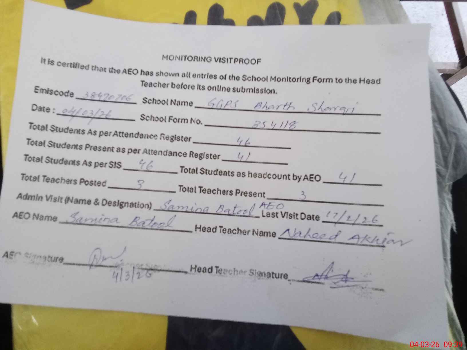 | Attendance Register | Head Teacher | MEA with School | Visit Proof |