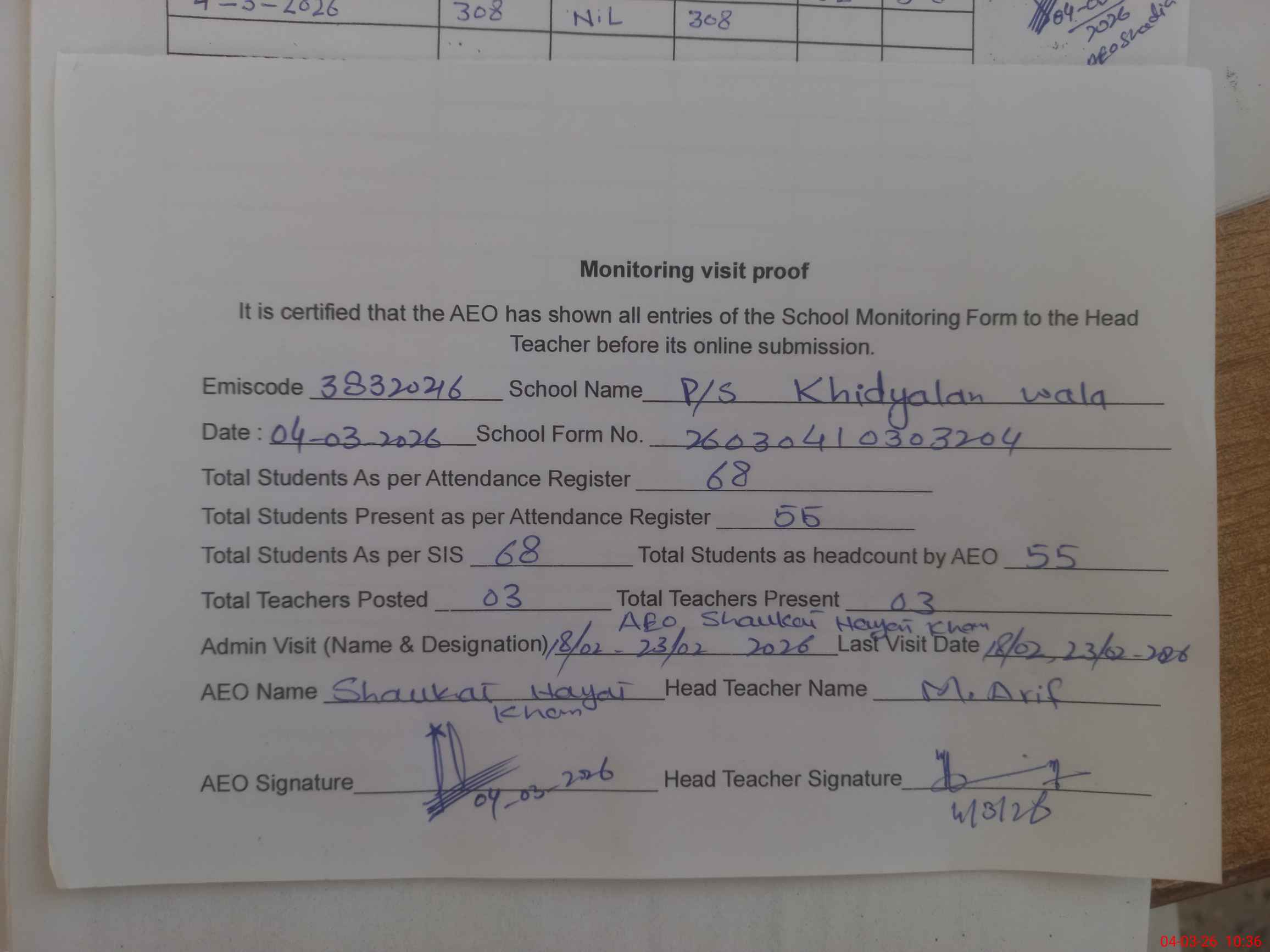 | Attendance Register | Head Teacher | MEA with School | Visit Proof |