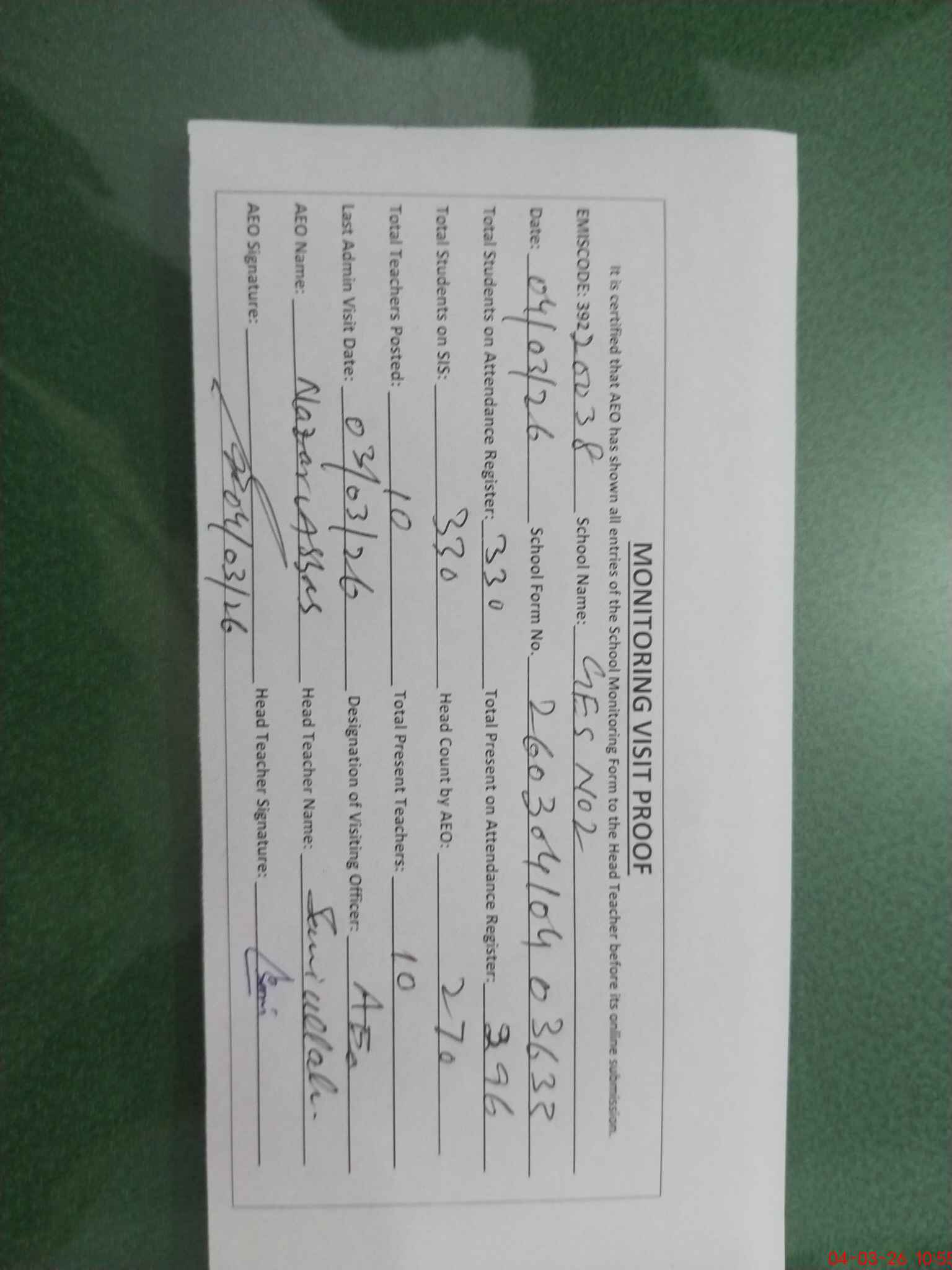 | EMIS Code: 39220038 | Name of School: GES MODEL NO. 2 D BLOCK ARIF WALA | |||