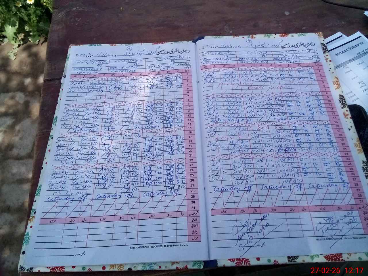 | CNIC | Full Name | Designation | R/C | Absence During Last Calender Month |