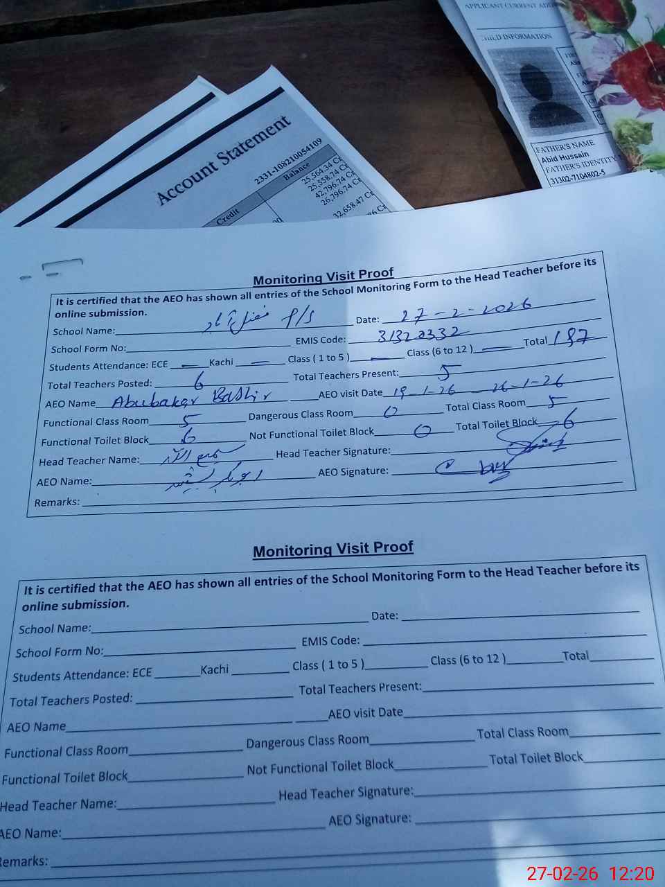 | Attendance Register | Head Teacher | MEA with School | Visit Proof |