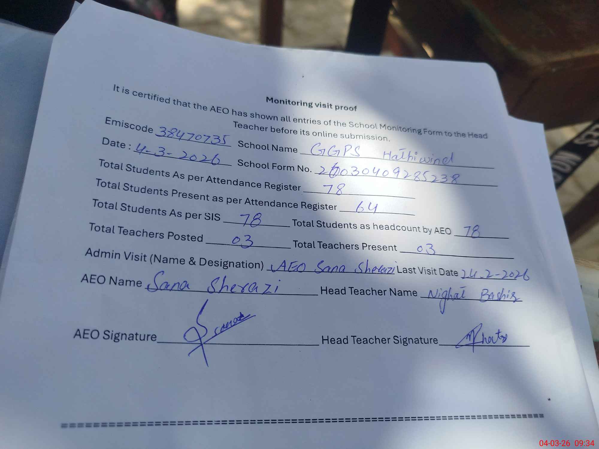 | Attendance Register | Head Teacher | MEA with School | Visit Proof |