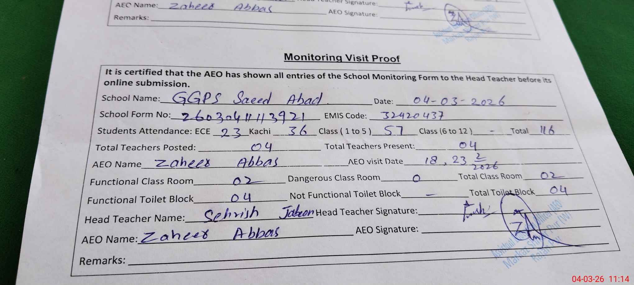 | EMIS Code: 32420437 | Name of School: GGPS SAEED ABAD | |||