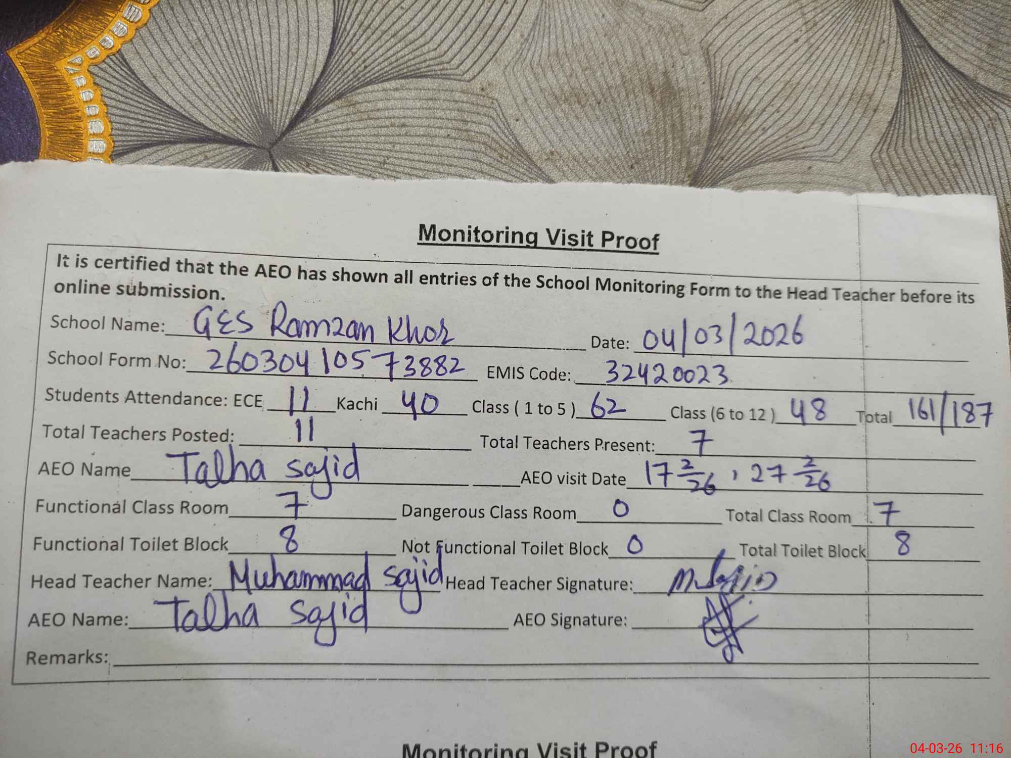 | Attendance Register | Head Teacher | MEA with School | Visit Proof |