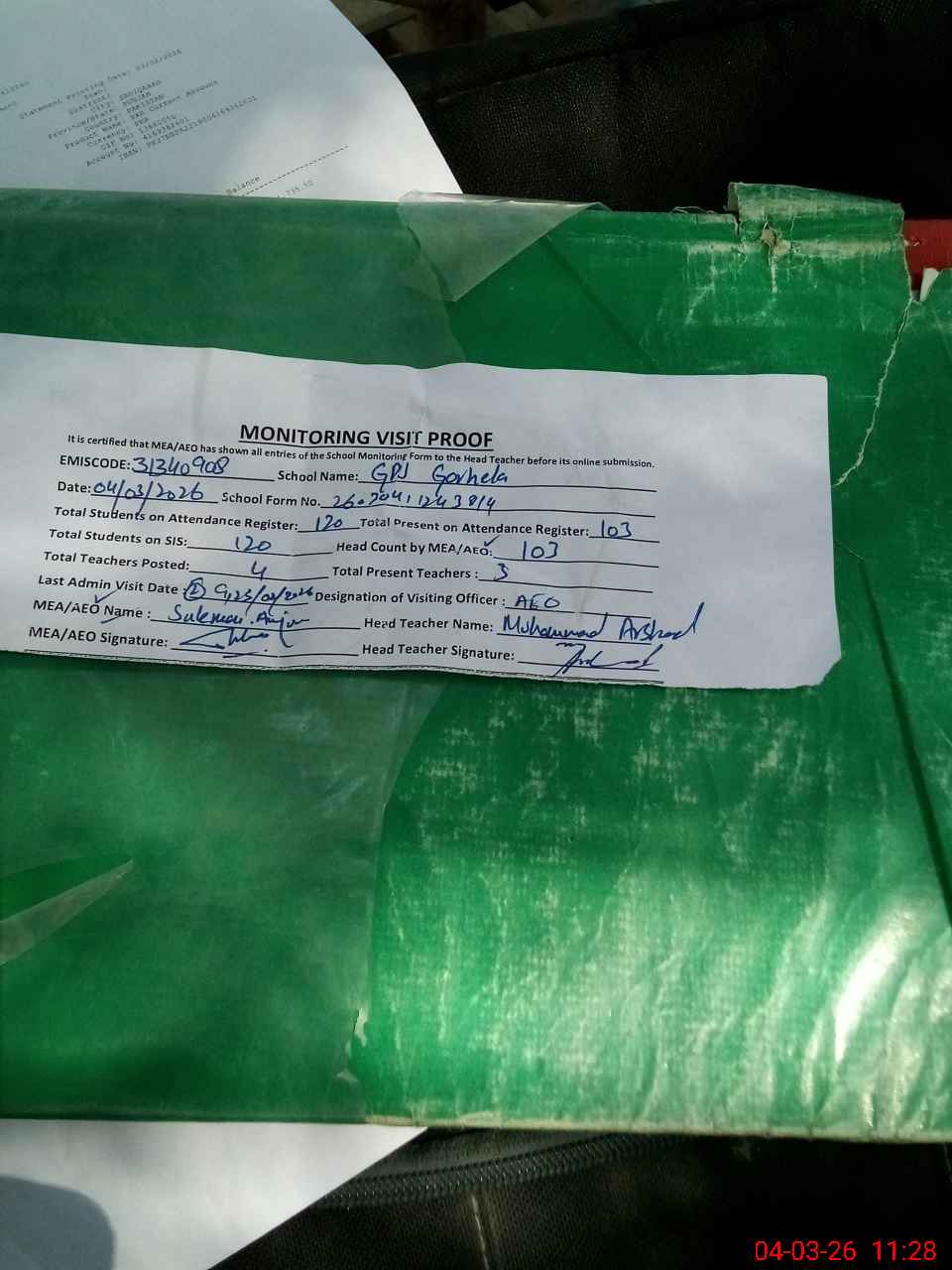 | Attendance Register | Head Teacher | MEA with School | Visit Proof |