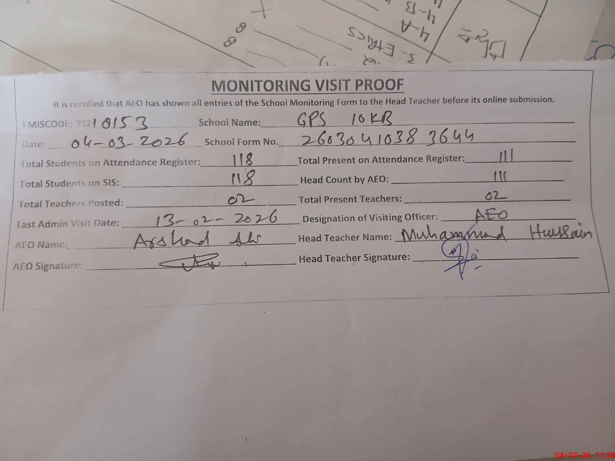 | Attendance Register | Head Teacher | MEA with School | Visit Proof |