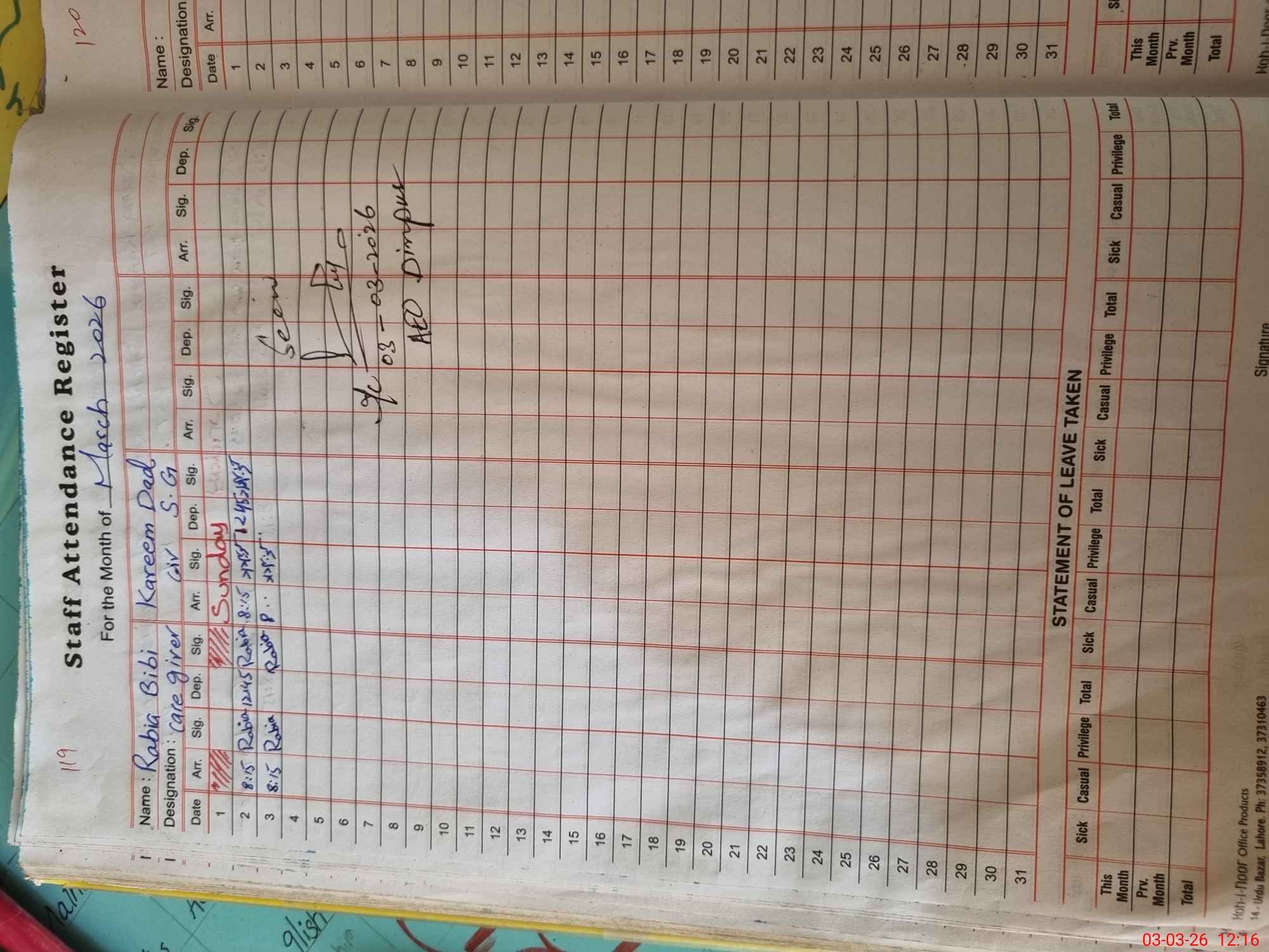 | CNIC | Full Name | Designation | R/C | Absence During Last Calender Month |