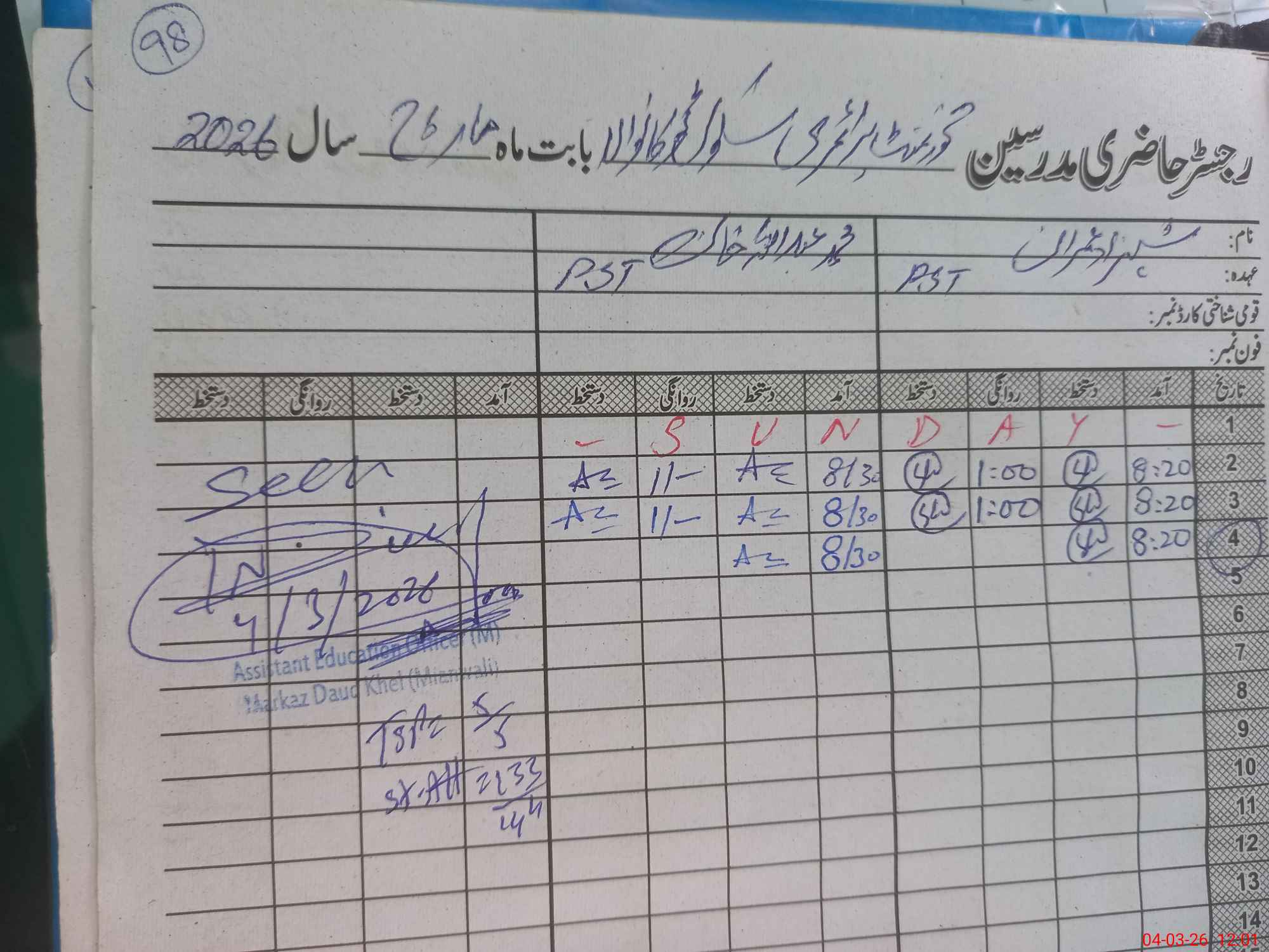 | District: MIANWALI | Tehsil: MIANWALI | Markaz: DAUD KHEL-MALE | Level: Primary | |