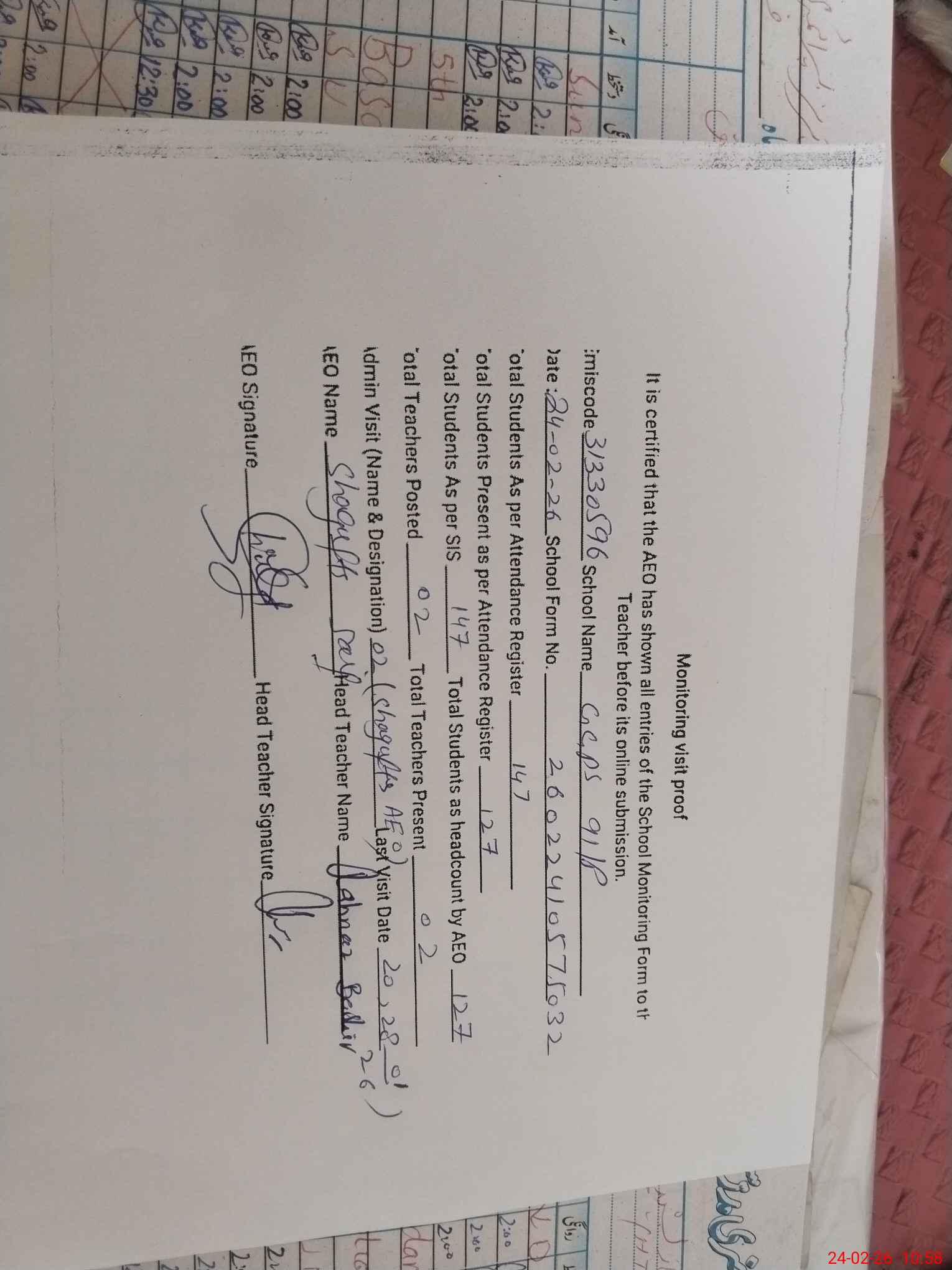| Attendance Register | Head Teacher | MEA with School | Visit Proof |