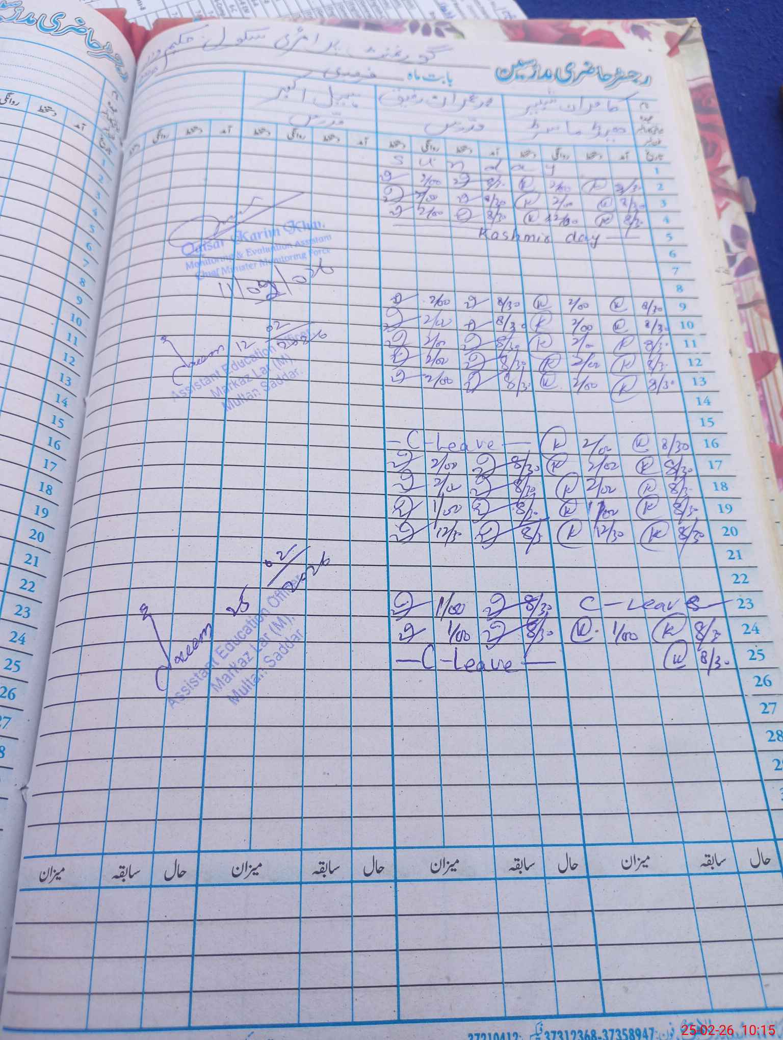 | CNIC | Full Name | Designation | R/C | Absence During Last Calender Month |