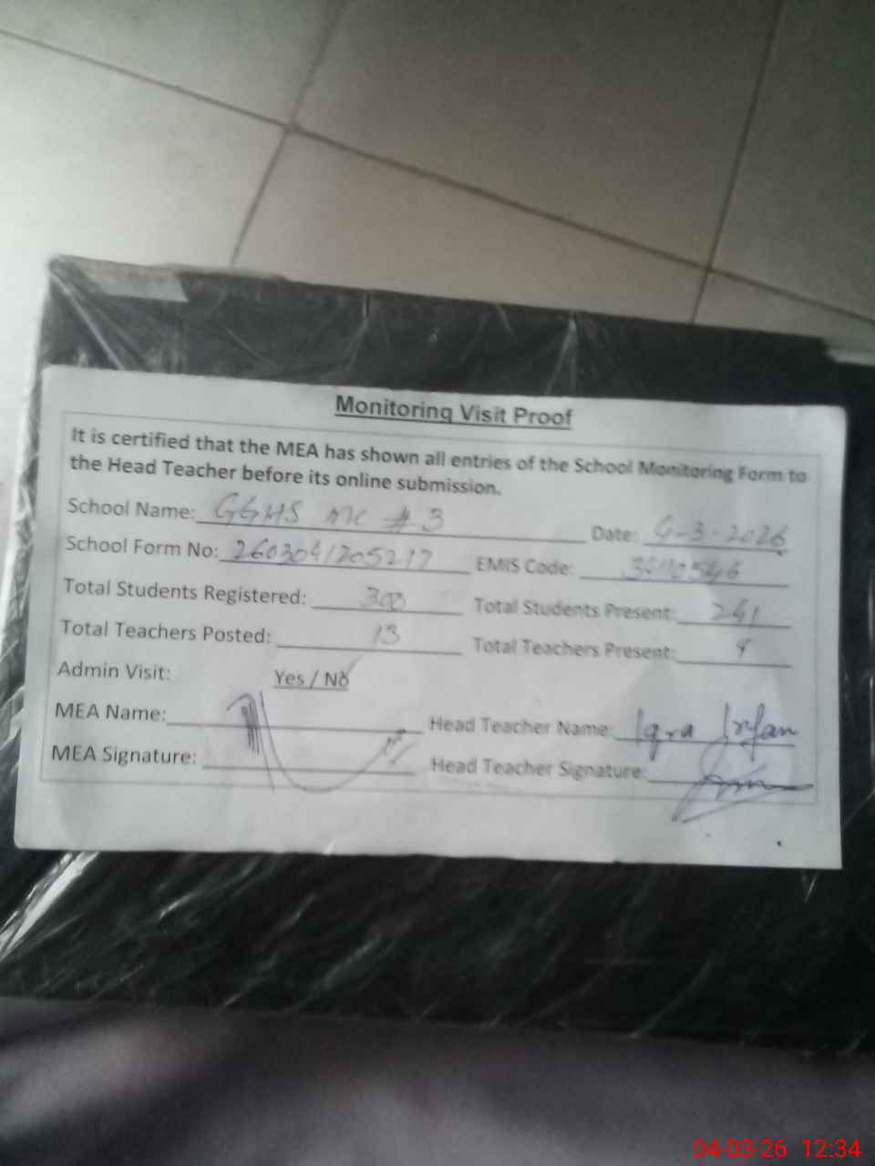 | Attendance Register | Head Teacher | MEA with School | Visit Proof |