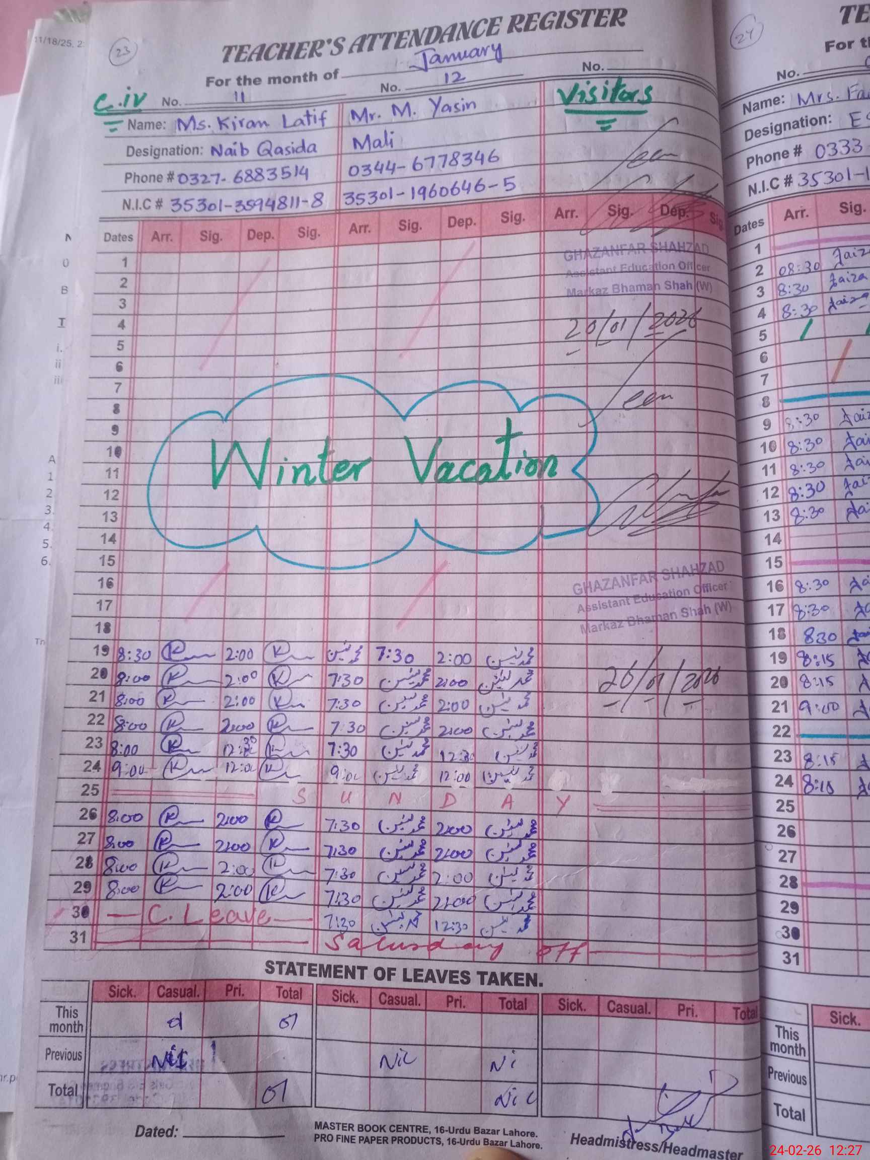 | CNIC | Full Name | Designation | R/C | Absence During Last Calender Month |