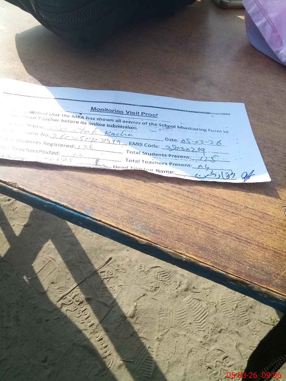 | Attendance Register | Head Teacher | MEA with School | Visit Proof |