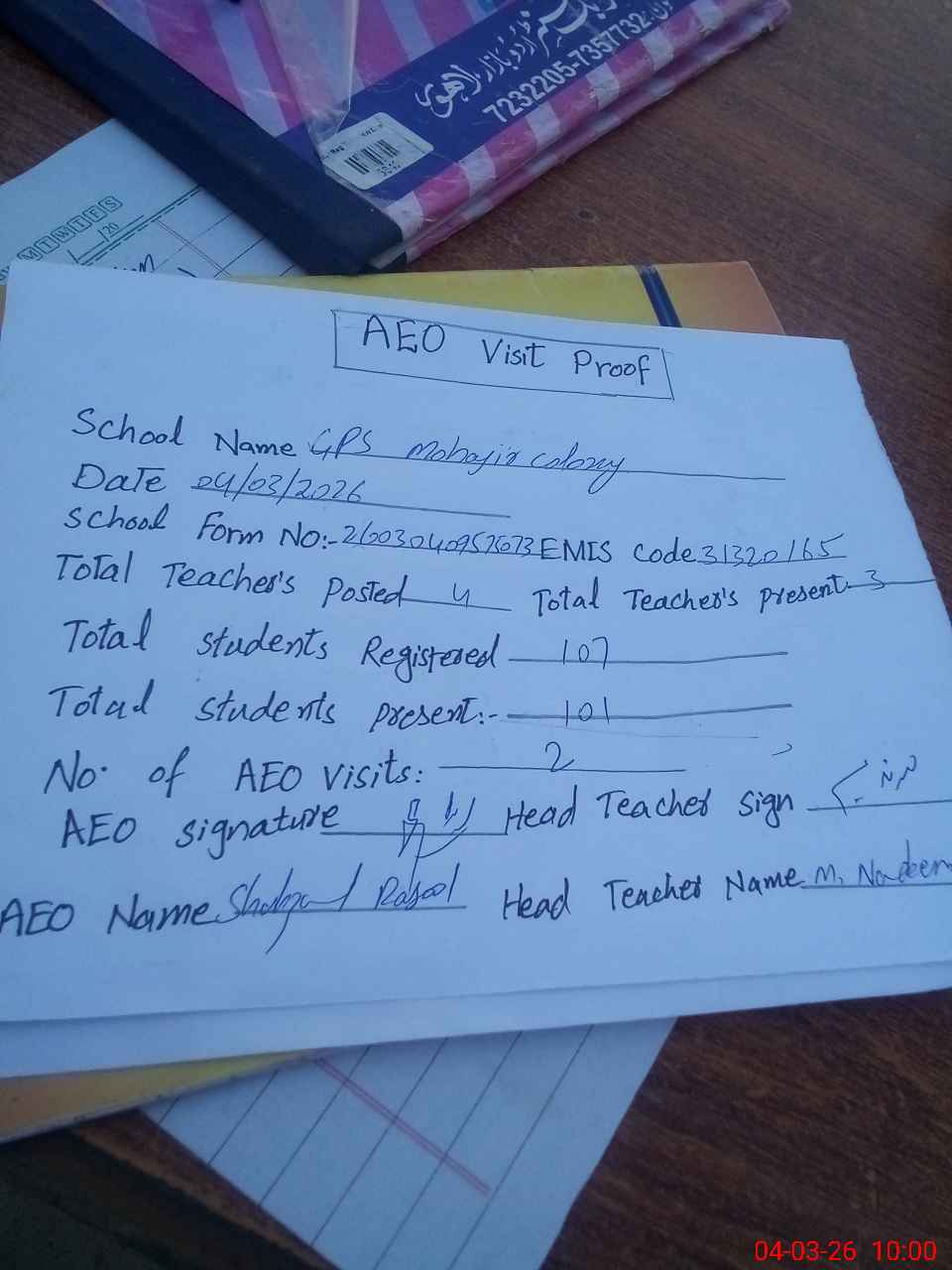 | Attendance Register | Head Teacher | MEA with School | Visit Proof |