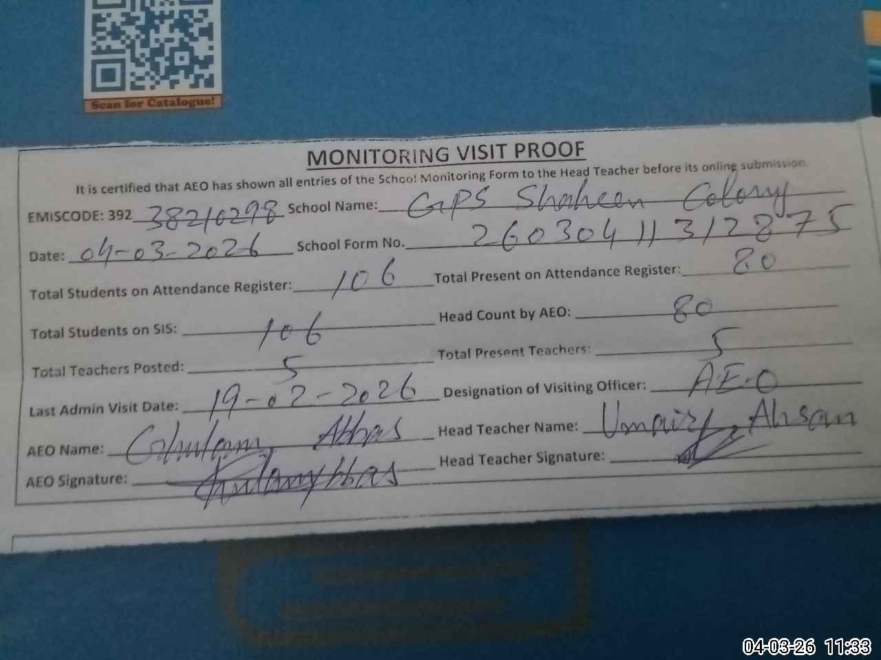 | EMIS Code: 38210298 | Name of School: GPS SHAHEEN COLONY | |||