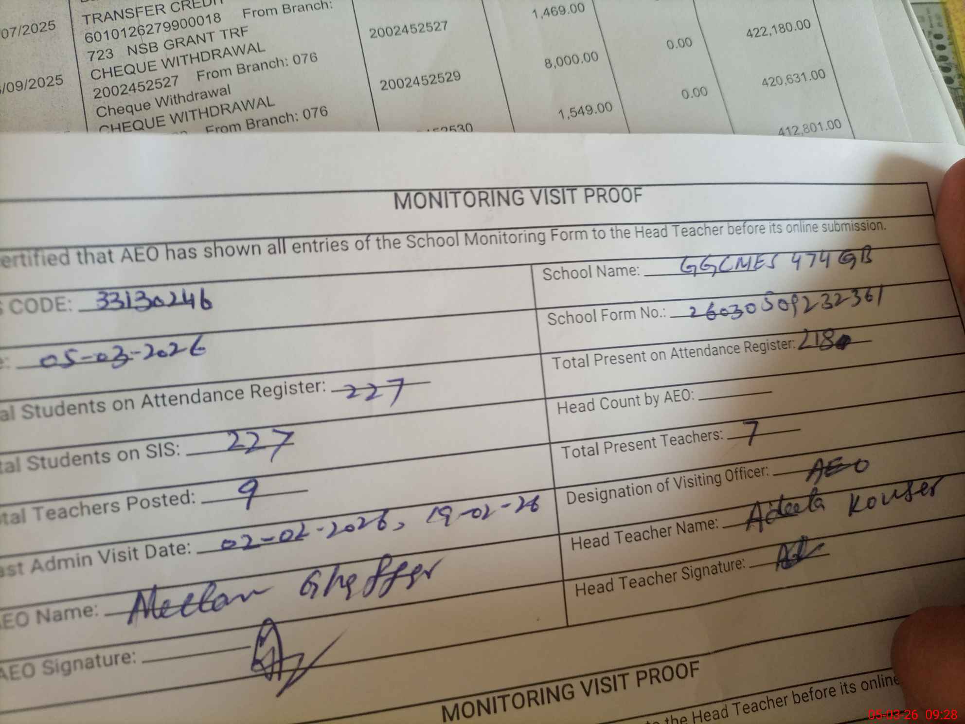 | Attendance Register | Head Teacher | MEA with School | Visit Proof |